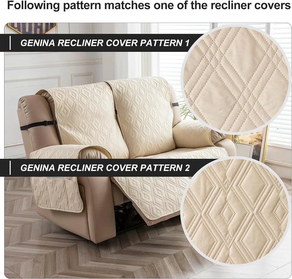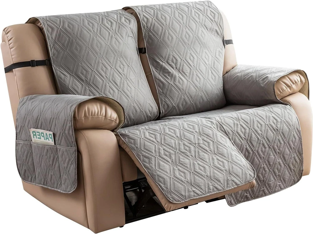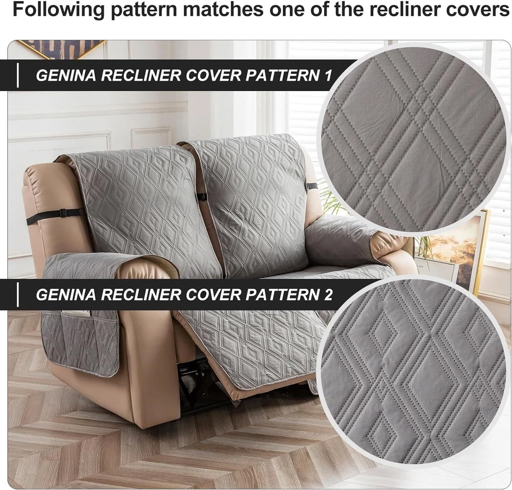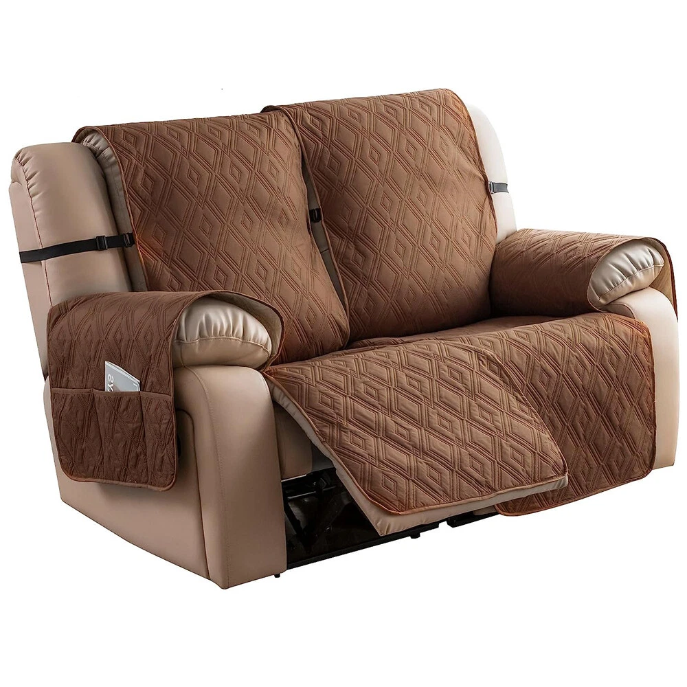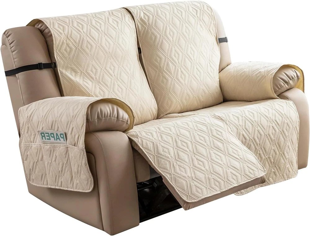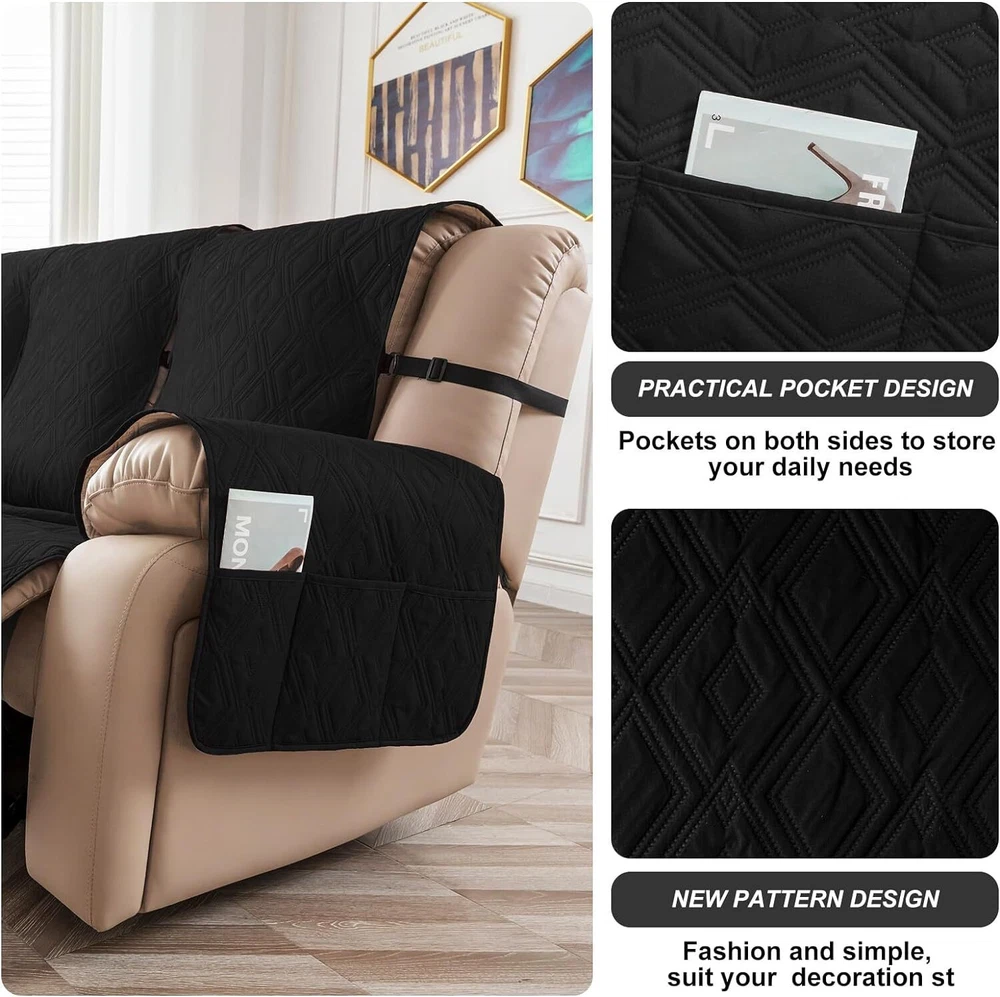 Stay in Place Anti-Slip Stay-in-Place Design: The reclining couch covers backrest and seat are designed separately, making it more fitting for your couch, staying in place. Each piece of recliner couch cover has a circular silicone rubber anti-slip design on the back, and is equipped with elastic bands and anti-slip buckles for double-layer reinforcement, not easy to slide. Water-Resistant & Durable: The durable sofa covers for 2 cushion couch consists of 4 layers of quilted fabric, thick microfiber, and thick poly foam filling for extra comfort and softness. 100% waterproof, protects your recliner furniture from everyday wears and tears, leaks and stains. Dimension Guide: The recliner couch protectors loveseat fits a seat width of 48 in. (2 pieces design, 23" per seat size). Recliner sofa covers 3 seat fits a seat width of 72 in. (3 pieces design, 23" per seat size). Please measure before purchasing, see measuring guide in photo. Furniture Protector: Sofa covers reclining are perfect for protecting your furniture from kids, scratches and fur from pets, dogs or accidental leaks. The unique diamond pattern design of recliner couch covers 2 seat gives your old furniture brand new look. Installation & Care: Couch covers for reclining couches installation is effortless. Please refer to our 2 seat recliner covers detail page for the installation guide to ensure a perfect fit. Machine washable, gentle wash, do not bleach and iron.