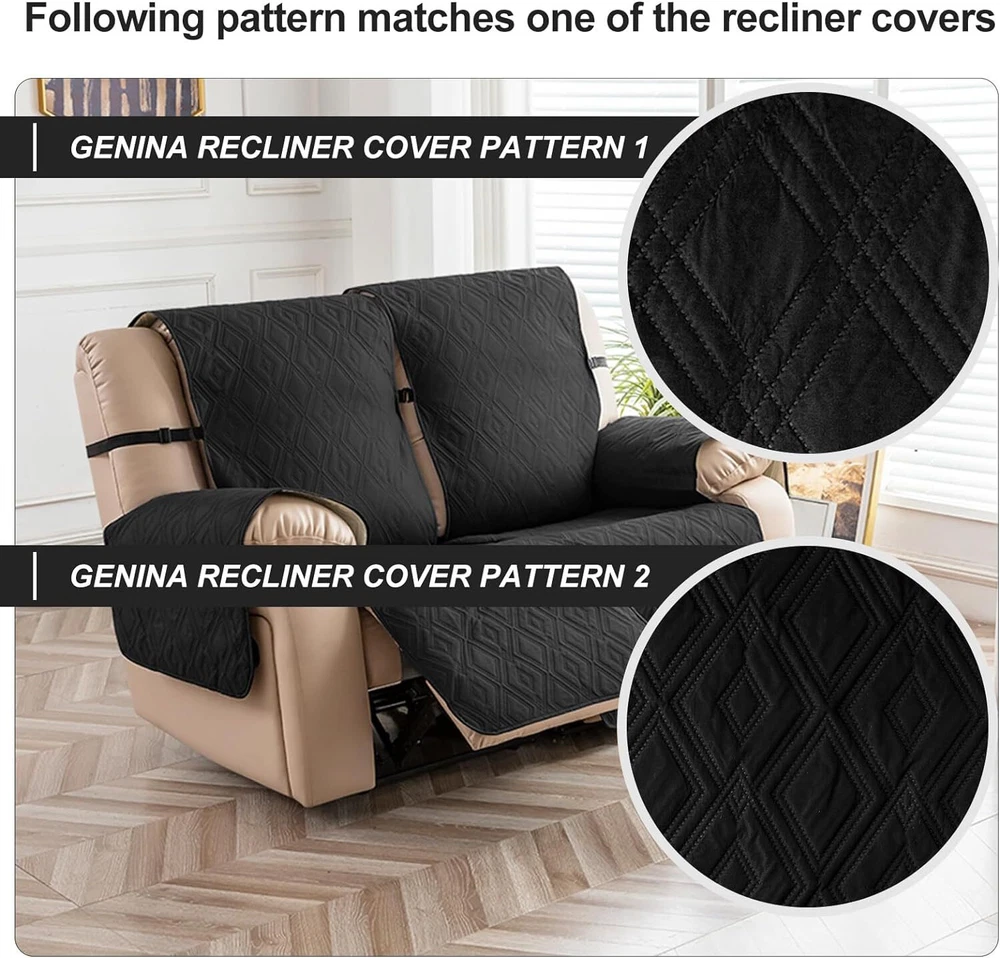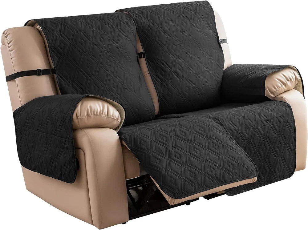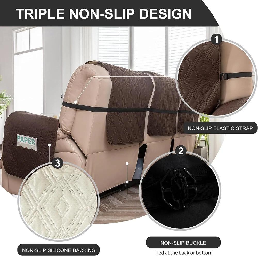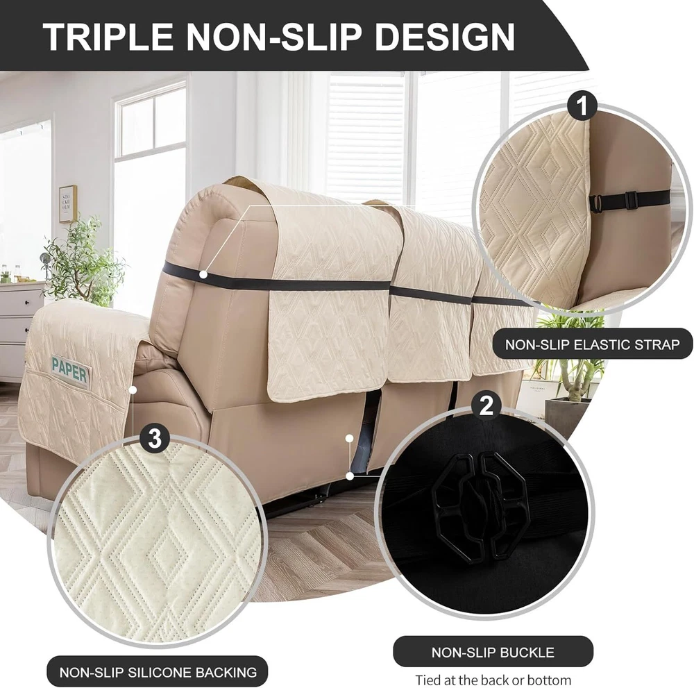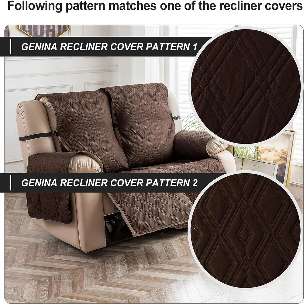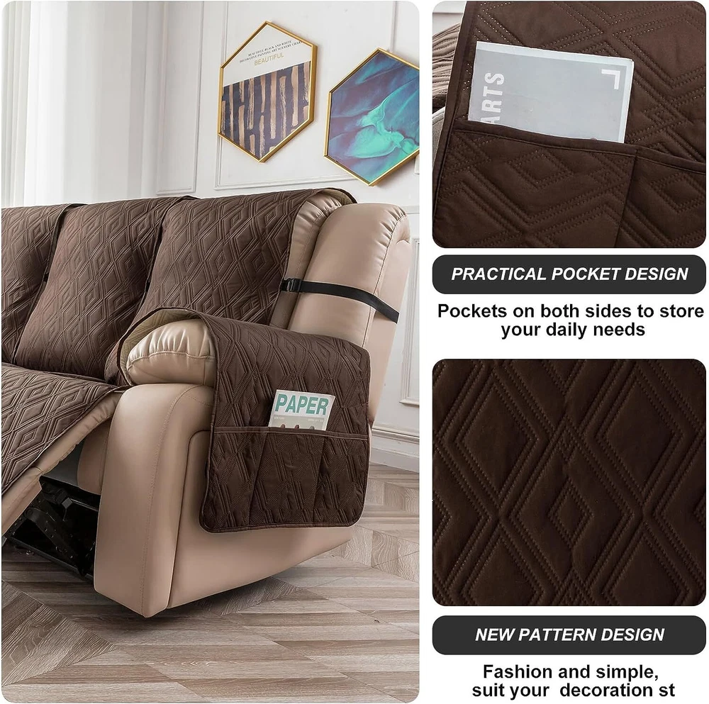 Stay in Place Anti-Slip Stay-in-Place Design: The reclining couch covers backrest and seat are designed separately, making it more fitting for your couch, staying in place. Each piece of recliner couch cover has a circular silicone rubber anti-slip design on the back, and is equipped with elastic bands and anti-slip buckles for double-layer reinforcement, not easy to slide. Water-Resistant & Durable: The durable sofa covers for 2 cushion couch consists of 4 layers of quilted fabric, thick microfiber, and thick poly foam filling for extra comfort and softness. 100% waterproof, protects your recliner furniture from everyday wears and tears, leaks and stains. Dimension Guide: The recliner couch protectors loveseat fits a seat width of 48 in. (2 pieces design, 23" per seat size). Recliner sofa covers 3 seat fits a seat width of 72 in. (3 pieces design, 23" per seat size). Please measure before purchasing, see measuring guide in photo. Furniture Protector: Sofa covers reclining are perfect for protecting your furniture from kids, scratches and fur from pets, dogs or accidental leaks. The unique diamond pattern design of recliner couch covers 2 seat gives your old furniture brand new look. Installation & Care: Couch covers for reclining couches installation is effortless. Please refer to our 2 seat recliner covers detail page for the installation guide to ensure a perfect fit. Machine washable, gentle wash, do not bleach and iron.
