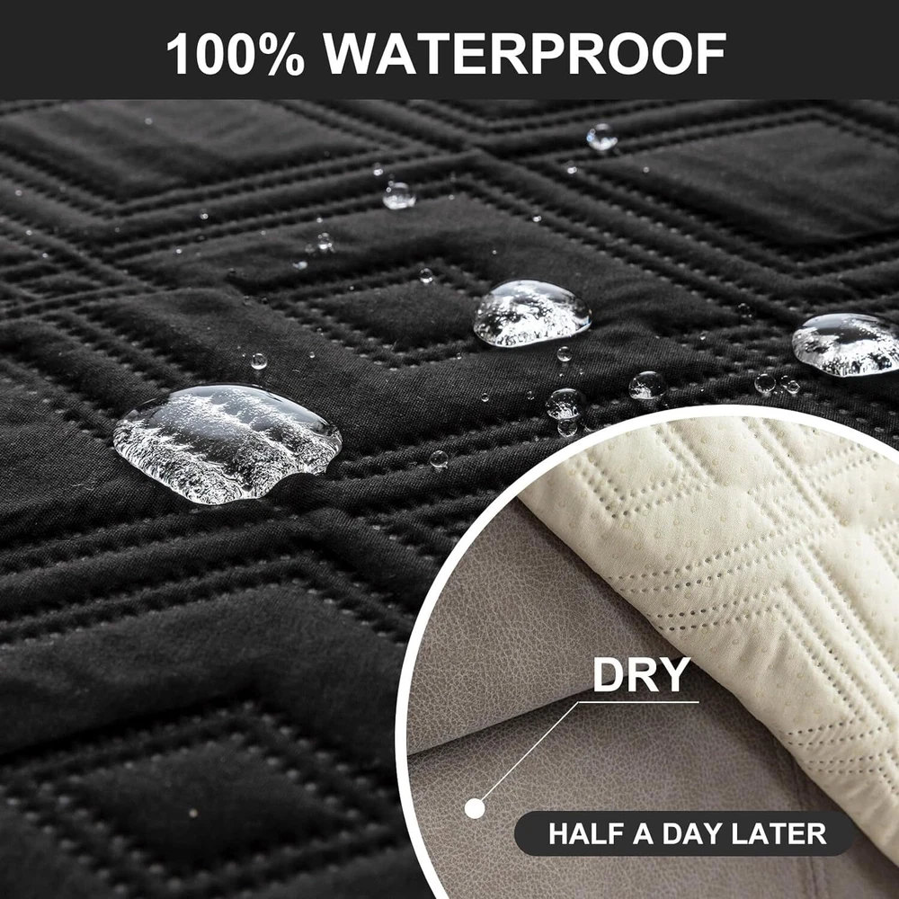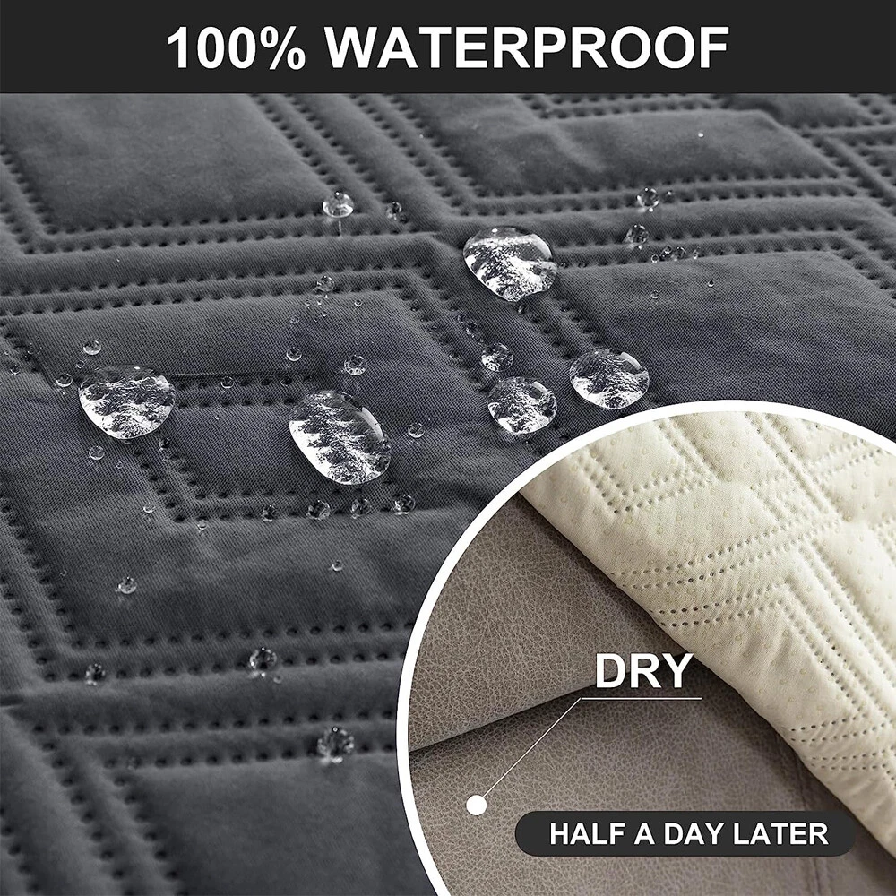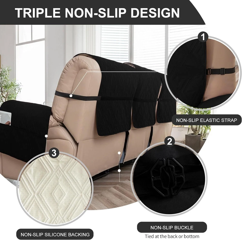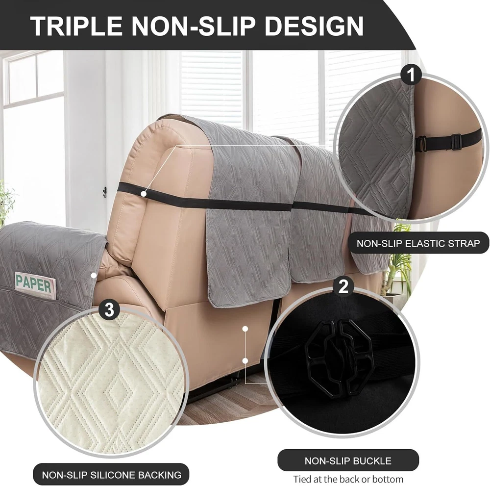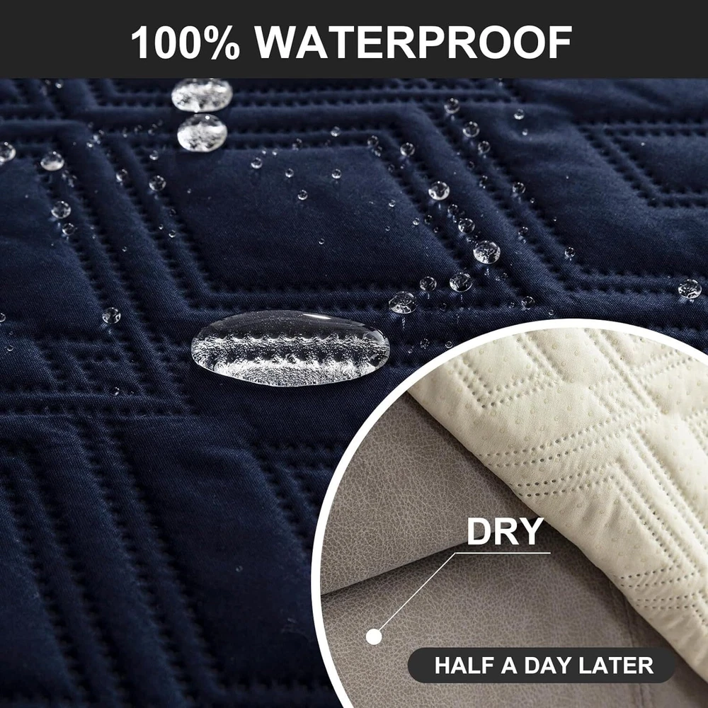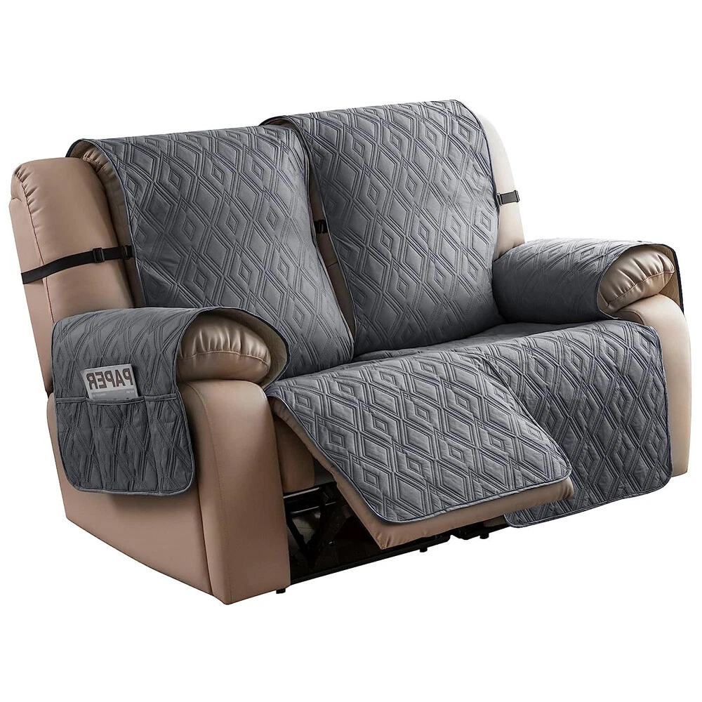 Stay in Place Anti-Slip Stay-in-Place Design: The reclining couch covers backrest and seat are designed separately, making it more fitting for your couch, staying in place. Each piece of recliner couch cover has a circular silicone rubber anti-slip design on the back, and is equipped with elastic bands and anti-slip buckles for double-layer reinforcement, not easy to slide. Water-Resistant & Durable: The durable sofa covers for 2 cushion couch consists of 4 layers of quilted fabric, thick microfiber, and thick poly foam filling for extra comfort and softness. 100% waterproof, protects your recliner furniture from everyday wears and tears, leaks and stains. Dimension Guide: The recliner couch protectors loveseat fits a seat width of 48 in. (2 pieces design, 23" per seat size). Recliner sofa covers 3 seat fits a seat width of 72 in. (3 pieces design, 23" per seat size). Please measure before purchasing, see measuring guide in photo. Furniture Protector: Sofa covers reclining are perfect for protecting your furniture from kids, scratches and fur from pets, dogs or accidental leaks. The unique diamond pattern design of recliner couch covers 2 seat gives your old furniture brand new look. Installation & Care: Couch covers for reclining couches installation is effortless. Please refer to our 2 seat recliner covers detail page for the installation guide to ensure a perfect fit. Machine washable, gentle wash, do not bleach and iron.