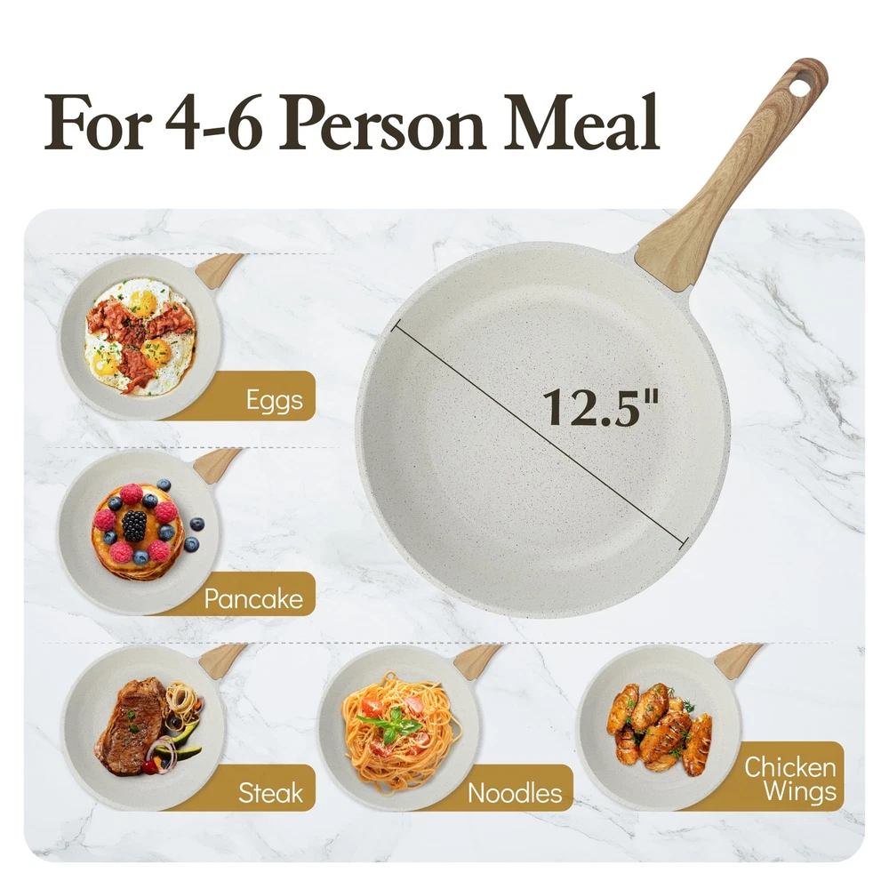 White Ceramic Nonstick Frying Pan HEALTHY CERAMIC SKILLET - Made of natural ceramic, SGS approved. free of PFOA, PTFE, PFAS, lead and cadmium, safe and healthy. No toxic substances will be produced even overheated. No coating to come off into your food. SUPER NONSTICK - The surface is smooth and super nonstick, eggs can just slide right off the pan without effort, which makes cooking easier and the food much more flavorable with less oil! INDUCTION COMPATIBLE - The nonstick frying pan is made of heavy-duty cast aluminum with induction base to prevent from warping, wobbling, or degrading over time, heats fast and evenly. Suitable for all stovetops, including Induction cooktop. HEAT RESISTANT HANDLE - The bakelite handle features woodgrain design, it is comfortable to grip and stays cool while cooking. The omelete pan is oven safe to 550°F (please remove the handle). EASE OF CLEANING - No one loves to do extra dishes. Its slippery, nonstick surface and no rivets design make the egg pan easy to clean in seconds with a towel, soap and warm water. Recommend Hand Washing to extend the life of pans. All skillets are made from recycled aluminum with healthy ceramic nonstick material to reduce carbon dioxideemissions by 80%.