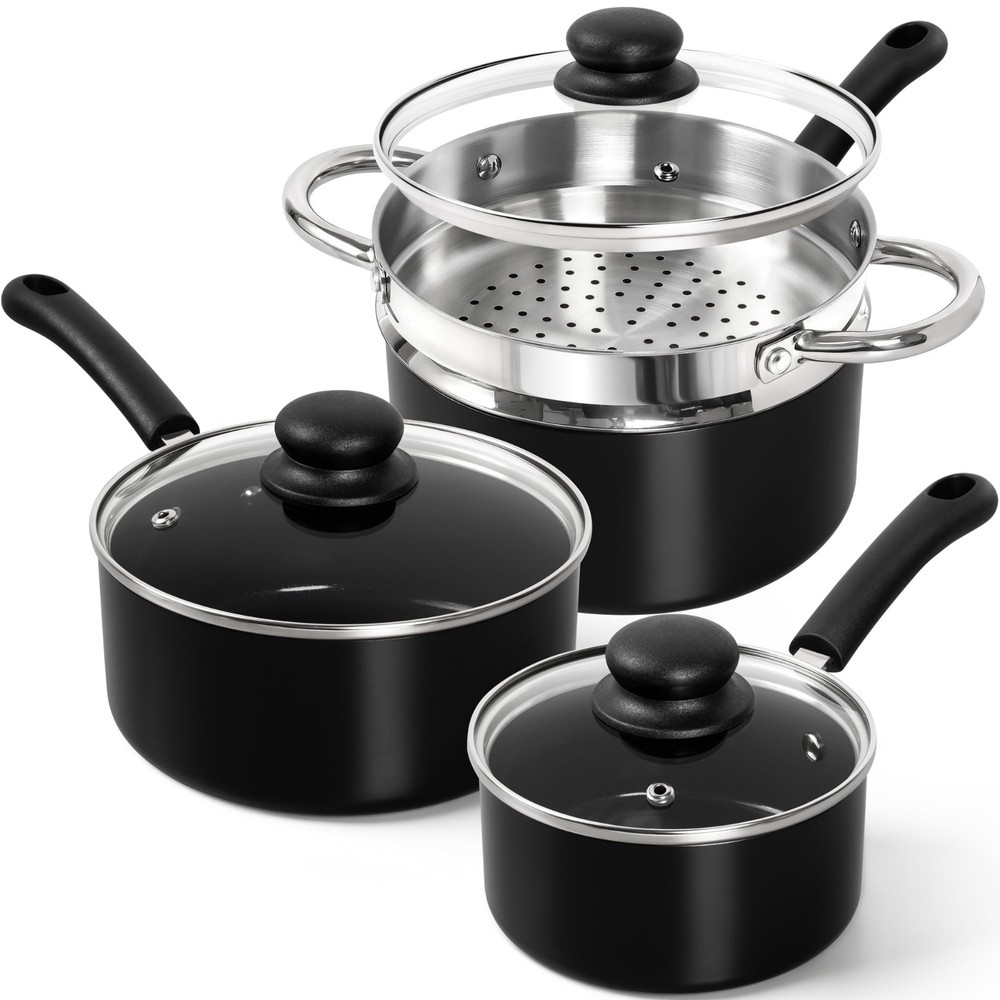 Premium Stainless Steel Steamer & Non-Stick Saucepan Set Steamer Features: Constructed from healthy, durable 304 stainless steel for long-lasting use. Dual handles ensure secure handling and easy maneuverability. Grooved base snap-locks onto your 3QT ceramic pot, preventing spills during use. Ideal for steaming grains, pastries, vegetables, eggs, and seafood. Perfect for preparing healthy breakfasts, lunches, and dinners. Super Easy to Clean: Excellent nonstick saucepan with lid simplifies your cleaning process. Quick rinse with soapy water after use keeps the saucepan looking like new. Superior Non-Stick & Perfect Size: Saucepan equipped with a health-conscious ceramic coating, free from APEO & PFOA. Available in 1-quart, 2-quart, and 3-quart sizes, perfect for everyday use. Fast & Even Heating: Nonstick pot features a durable aluminum alloy base for enhanced heating performance. Compatible with all stovetops and dishwasher safe for added convenience. Ergonomically Designed Lid & Handle for Convenience: Multi-purpose cooking pot set includes a heat-resistant glass lid for easy food monitoring. Saucepan locks in flavor and nutrients for healthier, tastier meals. Long handles designed for comfort and safety, staying cool and providing a firm grip. Handcrafted and double-riveted for added durability.