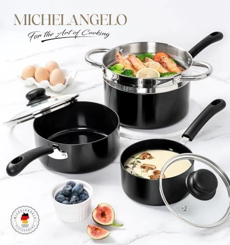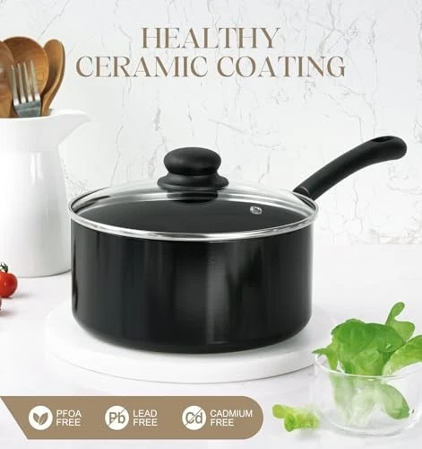 Premium Stainless Steel Steamer and Non-Stick Saucepan Set Steamer Crafted from Healthy, Durable 304 Stainless Steel - This steamer is designed with dual handles for secure handling and a grooved base that snap-locks onto your 3QT ceramic pot, preventing spills during use. Perfect for steaming grains, pastries, vegetables, eggs, and seafood — ideal for healthy breakfasts, lunches, and dinners. Super Easy to Clean - Our excellent nonstick saucepan with lid simplifies your cleaning process with its superior performance. Just a quick rinse with soapy water after use, and the saucepan looks like new. Superior Non-Stick & Perfect Size - The saucepan is equipped with a health-conscious ceramic coating, free from APEO & PFOA. Our saucepans come in 1-quart, 2-quart, and 3-quart sizes, perfectly suited for everyday use. Fast & Even Heating - The nonstick pot in our set features a durable aluminum alloy base that greatly enhances heating performance. The saucepans are suitable for all stovetops and are dishwasher safe. Ergonomically Designed Lid & Handle for Convenience - The multi-purpose cooking pot set includes a heat-resistant glass lid for easy food monitoring. The saucepan locks in flavor and nutrients for healthier, tastier meals. The long handles are designed for comfort and safety, staying cool and providing a firm grip. They are handcrafted and double-riveted for added durability.