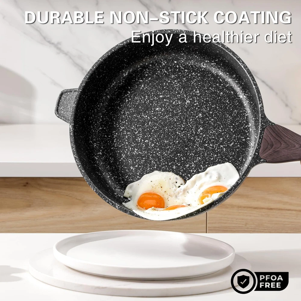 【Premium Non-Stick Coating】: Our sauté pan features a safe and healthy non-stick coating, SGS approved, and free from PFOA; enjoy effortless cooking with minimal oil for a healthier diet; the granite non-stick coating ensures a smokeless and safe cooking experience 【Versatile Saute Pan with Lid】: Experience the convenience of our 12" diameter, 3.2" height, and 5 quarts capacity saute pan; this large and deep skillet, also functioning as a deep frying pan and induction frying pan, is perfect for stir-frying, frying, boiling and deep-frying a variety of dishes with ease 【All Stove Compatible with Advanced Technology】: Our saute pan is designed with a high magnetic stainless steel base that works on all cooktops, including induction; its advanced die-casting aluminum technology guarantees anti-warping, quick and even heat distribution, saving you time and energy in the kitchen 【Detachable Wood Handle & See Through Lid】: Enjoy added convenience with the detachable woodgrain bakelite handle, allowing for easy storage and oven use; it is comfortable to grip and ergonomic, and keeps it cool during cooking; the see through glass lid allows you to check cooking progress while locking in flavor 【Effortless Cleaning】: Cleaning up is a breeze with our non-rivet construction and non-stick coating; simply wipe the saute pan with a sponge and warm soapy water, or toss it in the dishwasher for even more convenience; maintain a clean and pristine pan effortlessly