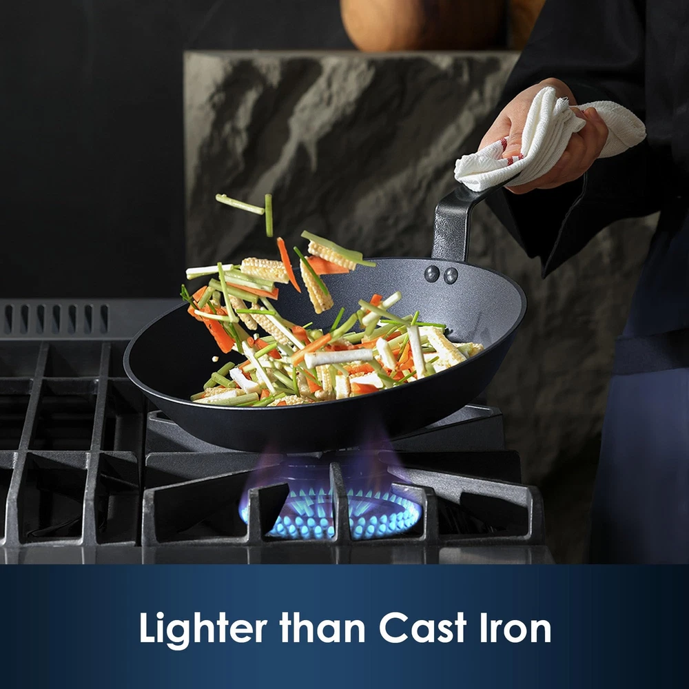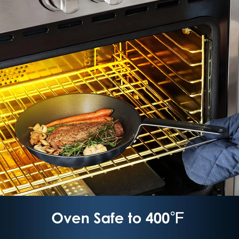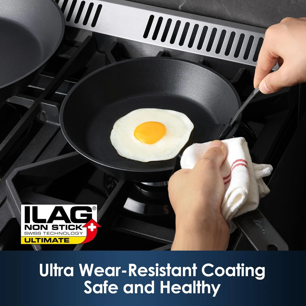 Upgraded Swiss ILAG Nonstick Coating: This frying pan features an advanced Swiss ILAG nonstick coating, providing 10 times greater durability and wear resistance compared to standard nonstick pans. Cooking eggs, pancakes, or anything else is a breeze—nothing sticks, and cleanup is effortless! Enhanced Magnetic Stainless Steel Base: The thickened, magnetic stainless steel base ensures even heat distribution and is compatible with all stovetops, including induction. It resists warping, providing long-lasting performance. Oven Safe & Dishwasher Safe: This frying pan is oven-safe up to 400°F, offering versatile cooking options, from stovetop to oven. While it's dishwasher safe, we recommend hand washing to preserve the coating and extend the pan's lifespan. Ergonomic Handle Design: The nonstick skillet features an ergonomically designed handle with a raised tail to relieve elbow pressure and prevent the handle from getting too hot during cooking. Scratch-Resistant Anodized Exterior: The anodized exterior of the pan is 10X more long-lasting and resistant to scratches than traditional cookware. No more worrying about the coating peeling or chipping, even with daily use. Lightweight Aluminum Body: Weighing 1/3 less than traditional cookware, this chef pan is easy to handle, allowing you to flip and toss food with one hand effortlessly.