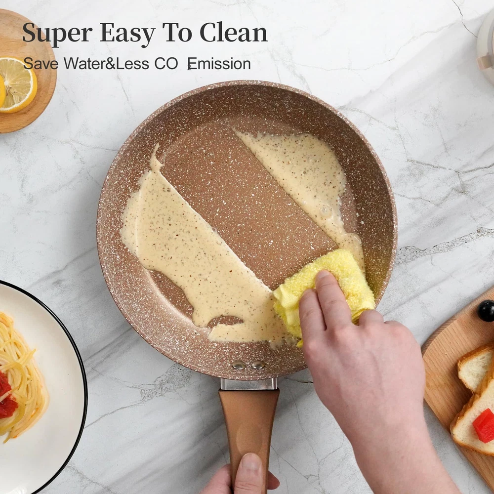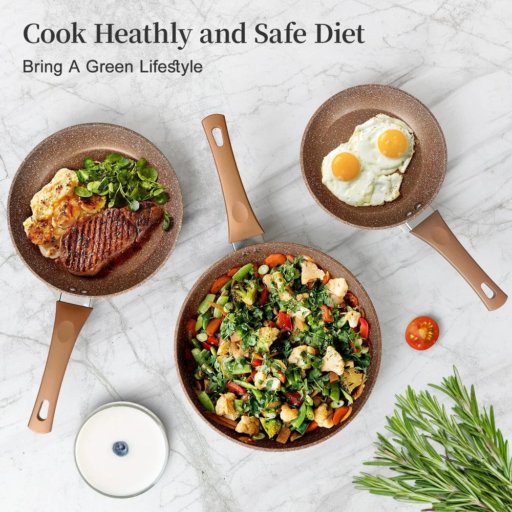 Nonstick frying pan set, set of 3 non stick frying pans, gold granite stone induction cookware, nonstick kitchen cooking pan, healthy and no toxic cookware, lightweight aluminum alloy pots and pans set 【Healthy And Safe Granite Coating】The frying pan set combines the natural texture and durability of marble to create a high quality nonstick cookware set. The non stick frying pans is coated with an imported coating, gets SGS approved, non-toxic, lead and cadmium free, PFOA and PFAS free. The pan set has superior nonstick performance. During cooking, Even if less oil, The foods slide over smoothly from the surface of cookware without effort, Brings us a less oil, smokeless and healthy diet 【3 Piece Non Stick Frying Pan Set】The cookware sets include an 8 inch, 9.5 inch and 11 inch nonstick frying pan. The 8 inch small egg pan, ideal for fried egg, bacon for breakfast. The 9.5 inch omelet pan, perfects for frying steak, salmon fish for lunch, The large skillet pan, perfects for the whole family meals for dinner. This multi frying pan meets all needs of daily life 【Compatible With All Stoves】The interior core of the pans set nonstick is made of professional grade aluminum alloy, the design of widened and thickened bottom, and thickened the wall of pan, ensure the frying pans heats up quickly and evenly, warp-resistance, cooks the authentic delicious foods. The high magnetic conductive stainless steel base used effectively on induction hob, gas stove, electric cooker, glass stovetop and ceramic stove, suitable for any kitchen and cooktop 【Durable Body and Unique Design】The nonstick cookware set has a flat base, the oil doesn't run around, ensures the foods even heat distribution. The frying pan set features a durable five layers structure for super non-stick performance and durability. The ergonomic heat resistant handle offers a better grasp and stay cooling feeling. The stackable frying pan set with hole, convenient for hanging, enough save space for kitchen. The pots and pans set is excellent kitchen essentials for new house 【Easy To Clean】The nonstick frying pan super easy to clean, just wipe the cooking pan over with a sponge with warm soapy water, or rinse it with flowing water, all the mess immediately disappear. Dishwasher safe, but recommend hand wash to protect the nonstick coating. oven safe to 302°F(Remove the handle before use the oven) 【High Quality Service And 】Before sending to , each product must undergo strict multiple quality checks. If there are any defects or damages to the product, please feel free to contact us and to provide you with a 100% satisfactory solution within 12 hours, provide a full 12-month and 30-day MONEY BACK