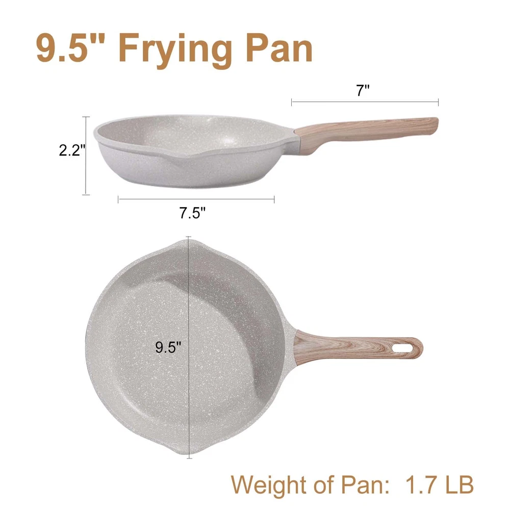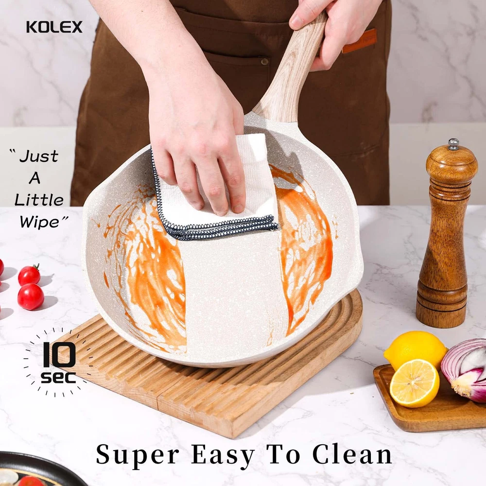 Easy To Clean : Omelet Pans can help you solve sticky or difficult-to-clean problems. Oil stains can be easily removed with just a soft sponge or rag Suitable All Stove:Suitable for induction cooktops, gas cooktops, ceramic cooktops, cooktops and cookers. Ergonomic Handle:The KOLE sauce pot has ergonomic woodgrain bakelite handle ,you can grip it comfortably. Good heat resistance let the handle stay cool while cooking.The cooking pan with high temperature resistant tempered glass lid could directly observe the food,making it easy to control the cooking process. Non-Stick Marble Coating :Nonstick granite material, SGS & EUROFIN approved. With 100% Free of PFOS, PFOA, our skillet ensures your daily cooking is always safer and healthier. WObble-Free Base&Heat Up Quickly and Evenly :The bottom of this pan connects smoothly to the cooktop, so it won't wobble easily when you're making food,Conducts heat quickly and evenly, retain heat longer, saves energy and time which allows it to be placed evenly over heat source.