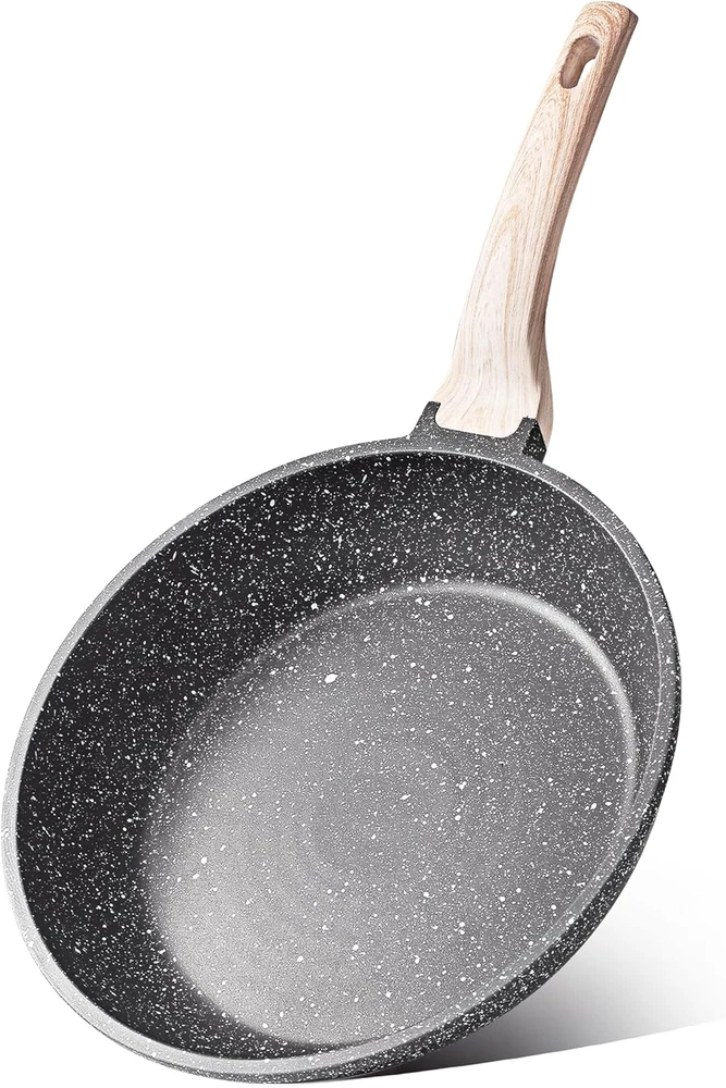 This nonstick granite fry pan is a game-changer! It heats up fast and cooks evenly without hot spots, making perfect eggs and omelets with little to no oil. The eco-friendly, PFOA-free coating is safe and super easy to clean—just a quick rinse or wipe does the trick. Works on all stoves, including induction, and the sturdy design ensures even heat distribution. Less smoke, less mess, and healthier cooking—love it!