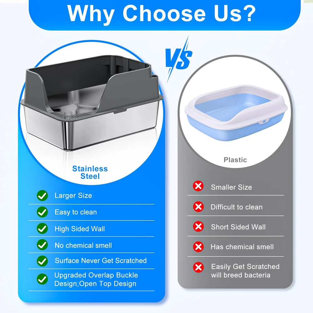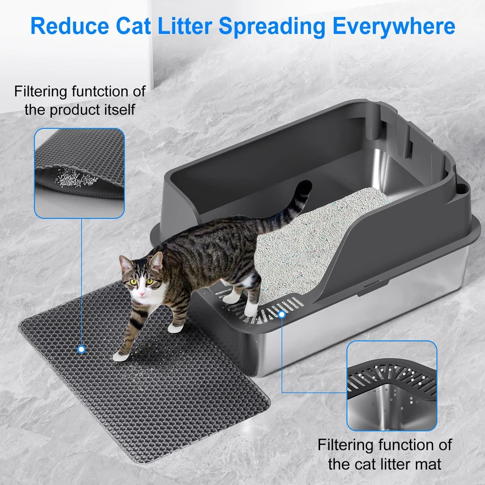 stainless steel cat litter box Side Opening & High-Sided Prevents Urine Leak: The cat litter box with a lid includes a top section that tightly overlaps the bottom. The 6-inch high walls prevent litter from being kicked out, and the side opening prevents cat urine from spilling everywhere Non-stick Stainless Steel Material: Crafted from qualified stainless steel, this stainless steel cat litter box resists rust, scratching, and wear, ensuring longevity. The design of the side open design feature of the stainless steel litter box with high sides, no matter where you place it in your home, it is convenient for your kitten to enter and exit Extra Large Size: The XL cat litter box is made of a stainless steel box + PP lid, measures 23.6x15.9x12 inches(L*W*H) with plenty of space for the cat to move around freely, and the 6-inch litter box depth can hold enough litter Easy to Clean: Non-stick surface of the metal cat litter box with lid makes cleaning easy. Unlike a plastic litter box, the stainless steel cat litter box does not absorb stains or odors, maintaining a fresh environment for your cat Unique Cat Supplies Storage Design: Our Cat litter boxes for indoor cats come with a Cat Litter Scoop/Cat Litter Mat,/Bag,/Stickers. The spoon can be placed in the holder box through the back holes. And the cat litter mat can help collect cat litter. And the bag for you to deal with the waste. And the sticker for you to decorate the box