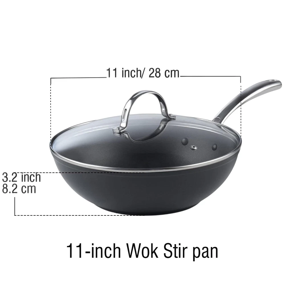 The 11-Inch Hard Anodized Nonstick Wok Stir Fry Pan Flat Bottom With Lid, Black, 28cm has a hard anodized surface that is durable, heats evenly and quickly, and prevents hot spots. Material is harder than steel, thick, and chip-resistant. Nonstick performance for easy food release and tossing, cleaning, and allows for healthy cooking. Tempered glass lid with steam vent is protected by a stainless steel rim to view food. Long riveted stainless steel handle stays cool and comfortable and is strong. Wide and deep to hold a large amount of food for multipurpose use: stir frying, sautéing, frying, and more. Not induction . Works on gas, , glass, ceramic, halogen, etc. Oven safe to 500°F, glass lid to 350°F. Dishwasher safe, hand wash recommended. 【Hard Anodized Surface】Has a hard anodized surface that is durable, heats evenly and quickly, and prevents hot spots. 【Non-stick Performance】Nonstick performance for easy food release and tossing, cleaning, just need to cook with little oil; and allows for healthy cooking by using various traditional cooking techniques like pan-frying, braising, and deep-frying. 【See-Through Lids】Tempered glass lid to view food; wide and deep to hold a large amount for multiple uses. 【Keep Cool Handle and Oven Safe】Long riveted stainless steel handle stays cool and comfortable; oven safe to 500°F, glass lid to 350°F. 【Works on Most Stovetops】 Not induction . Works on gas, , glass, ceramic, etc; hand wash recommended, Given diameter is outer diameter.