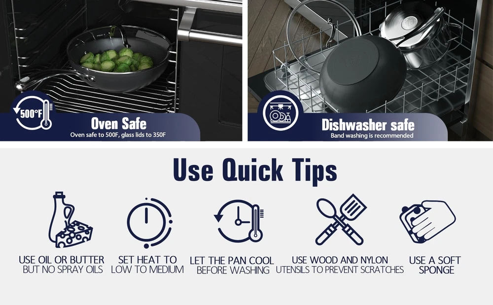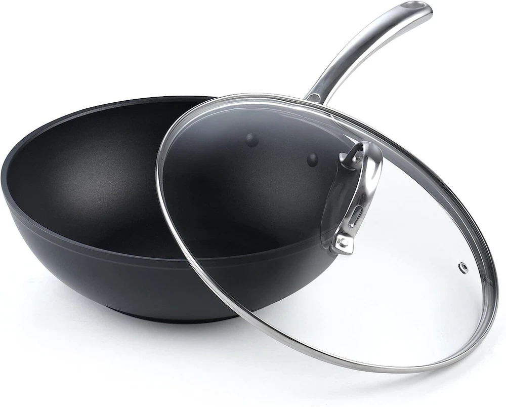 The 11-Inch Hard Anodized Nonstick Wok Stir Fry Pan Flat Bottom With Lid, Black, 28cm has a hard anodized surface that is durable, heats evenly and quickly, and prevents hot spots. Material is harder than steel, thick, and chip-resistant. Nonstick performance for easy food release and tossing, cleaning, and allows for healthy cooking. Tempered glass lid with steam vent is protected by a stainless steel rim to view food. Long riveted stainless steel handle stays cool and comfortable and is strong. Wide and deep to hold a large amount of food for multipurpose use: stir frying, sautéing, frying, and more. Not induction . Works on gas, , glass, ceramic, halogen, etc. Oven safe to 500°F, glass lid to 350°F. Dishwasher safe, hand wash recommended. 【Hard Anodized Surface】Has a hard anodized surface that is durable, heats evenly and quickly, and prevents hot spots. 【Non-stick Performance】Nonstick performance for easy food release and tossing, cleaning, just need to cook with little oil; and allows for healthy cooking by using various traditional cooking techniques like pan-frying, braising, and deep-frying. 【See-Through Lids】Tempered glass lid to view food; wide and deep to hold a large amount for multiple uses. 【Keep Cool Handle and Oven Safe】Long riveted stainless steel handle stays cool and comfortable; oven safe to 500°F, glass lid to 350°F. 【Works on Most Stovetops】 Not induction . Works on gas, , glass, ceramic, etc; hand wash recommended, Given diameter is outer diameter.