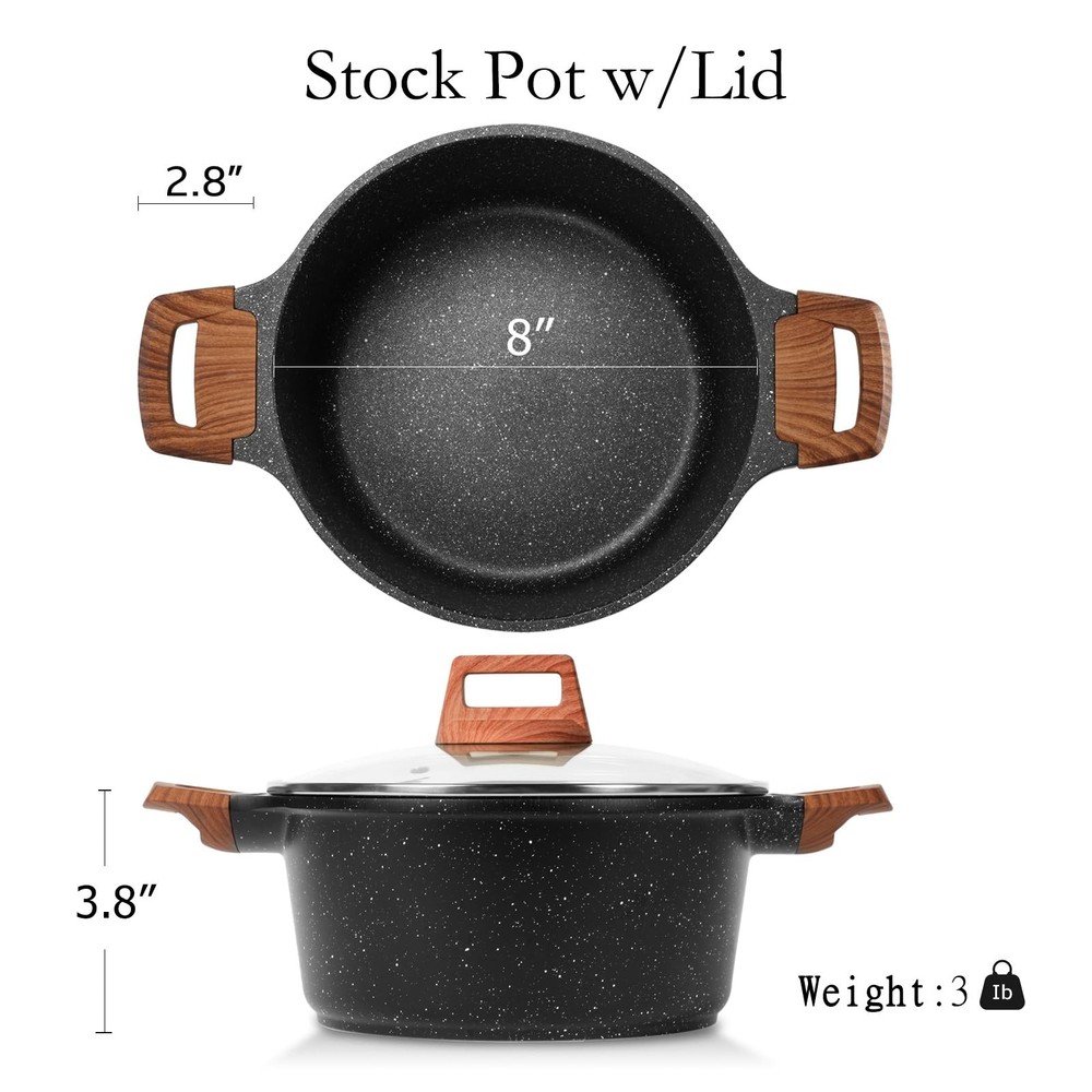 SAFE frying pan set is free of any toxins, and 100% PFOA, LEAD, CADMIUM free. NONSTICK GRANITE COATING Nonstick granite coating to ensure excellent nonstick performance, making cooking easier and cleanup. EASY TO CLEAN Nonstick interior stands up to everyday use and keeps food sliding smoothly along the surface, making cooking easier and cleanup. PREMIUM CASTING ALUMINUM Made of casting aluminum that provides break resistant and does not warp which ensures its durability and longevity. HEATS QUICKLY & EVENLY 4.5mm thicken induction compatible bottom provides a stable heat distribution and rapidly heating up. 2mm thicken aluminum body heat conductive can ensure uniform heat dissipation and prevent hot spots. HEAT RESISTANT BAKELITE HANDLE Ergonomic bakelite handle are suitable for grasping and staying cooking while cooking. Suitable handle lengths, and curved radians which is able to help you master your cooking. There are no rivets from the inside ensuring easy cleanup as well. SUITABLE FOR STOVE nonstick skillet set is perfectly suitable for gas, ceramic, electric, halogen or induction stoves. NOTICE Low to medium heat is recommended. Wooden or silicone utensil is recommended. Oven and dishwasher are not applicable. Please use sponge or soft scouring pad to clean . Please do not put the handle on high temperature. Please tighten the screw after receiving. AFTER-SALE SERVICE If you receive this frying pan set with any damage or if it malfunctions in any way, please free free to contact us, we will reply to you within 24 hours to address your concern. Non-Toxic Ceramic Coating - ceramic stock pot free of PTFE & PFOA, lead, cadmium and other toxic materials that can leach into your food, making them safe for you, your family and the environment. Multi-Use Small Pot with Lid - This small cooking pot is perfect for making sauces, boiling water, pasta, spaghetti, stew pot, etc. the glass lid makes it convenient to see the cooking status, and the heat resistant bakelite handle are suitable for grasping and staying cooling while cooking. Durable & Easy to Clean - The cast aluminum body combined the advantage of cast-iron and traditional riveted cookware, requiring less oil or butter for cooking and minimal scrubbing for a spotless clean, giving you a healthier and more enjoyable at-home cooking experience. Compatible with All Stovetops - Design with magnetized base makes it conducts heats quickly & evenly, used effectively on gas, ceramic, electric, and induction stove tops, made for any kitchen and cooktop, an ideal replacement solution for your aging, worn out, or failed cooking equipment. Service & Guarantee - All Cookware passes strict multi inspection process. In case you receive defect items caused by delivery or If any problems while using our product, you will be guaranteed to get a 100% refund or a new replacement. Really appreciate your trust and ordering!