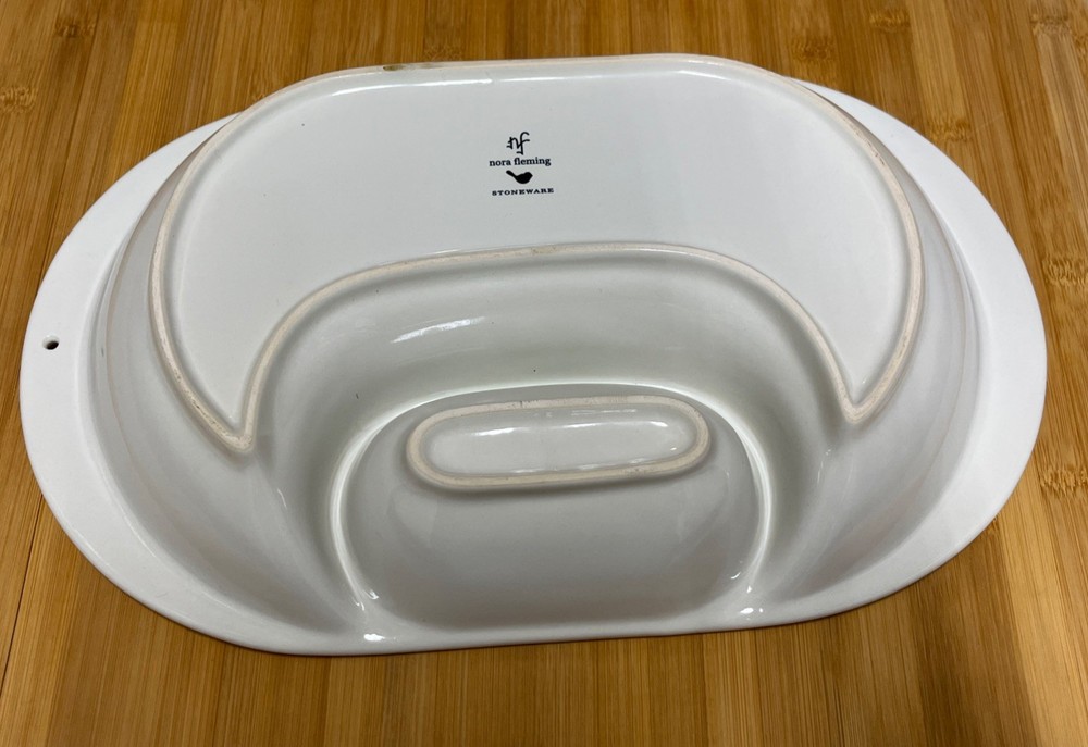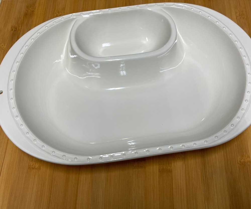 Like new- never used not in new box - The Nora Fleming Stoneware Pearl Dot Chip and Dip Oval Serving Bowl is a stylish and practical addition to any kitchen or dining room. The white stoneware bowl features a charming pearl dot pattern, perfect for serving chips and dips. The oval shape adds a touch of elegance, while the inclusion of a box makes it easy to store and transport. This versatile piece is ideal for entertaining guests or everyday use in your home.