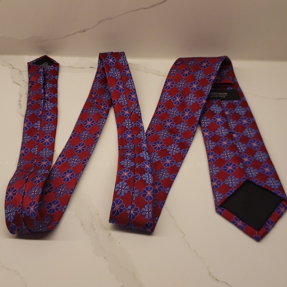 #1456 Nordstrom Men's Tie Red Blue Floral 100% Silk This men's red tie with blue floral design is in very good condition with minimal wear. See photos for condition and measurements. Thanks for stopping by.