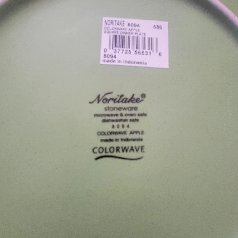 Noritake Colorwave Apple One Place Setting with 4 Pieces Plates are square with a wave. Colorwave collection has a matte-textured color on the outside. Glossy color on the inside. Green Color on the outside like granny green apples. Cream Color on the inside. 8094 The tag is still on the plates. Still being sold in upscale department stores. Square dinner plate about 10 7/8 inches Square salad plate about 8 1/2 Inches One bowl about 7 inches One cup about 4 inches high and 3 1/2 inches wide Microwave, Dishwasher, Oven Safe Made in Indonesia
