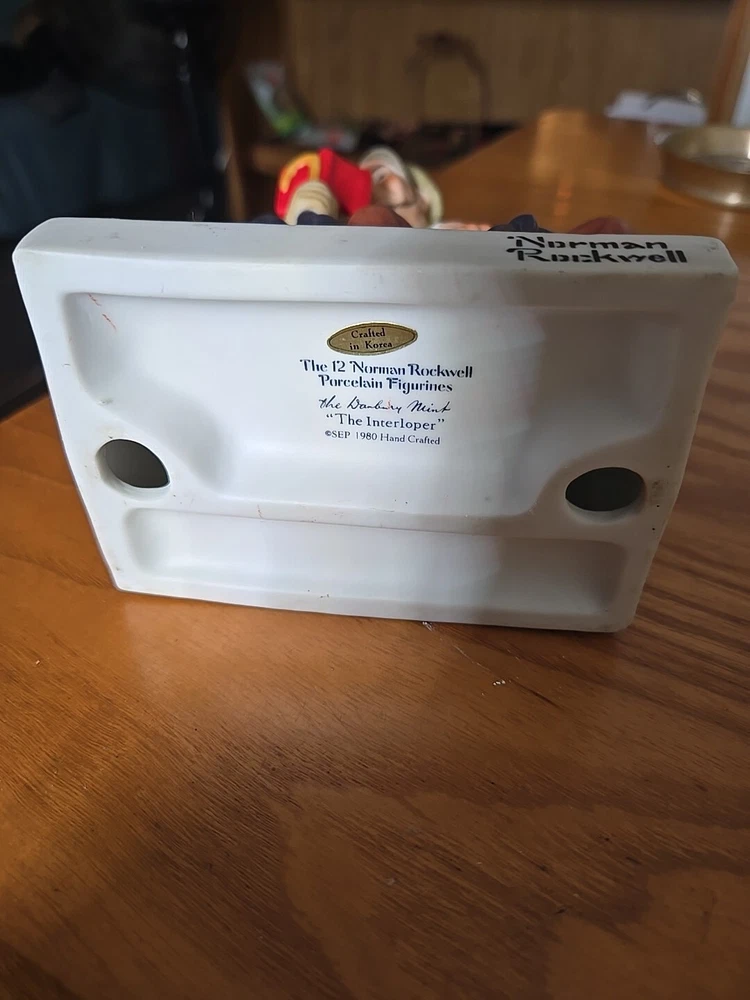 Time Period Manufactured:1980-1989Country/Region of Manufacture:JapanYear Manufactured:1980Color:MulticolorModel:The InterloperPackaging:UnboxedEra:Mid 20th Century (1941-1969)Finish:PaintedBrand:Danbury MintNumber in Pack:1Style:1980sType:FigurineItem Weight:1.6 oz.Material:PorcelainDepartment:AdultsHandmade:YesCustom Bundle:NoCollection:The 12 Norman Rockwell FigurinesItem Height:6"Theme:PeopleSubject:MenEngraved:NoShape:RectangleAdditional Parts Required:NoArtist:unknownOccasion:All OccasionsFeatures:Limited EditionItem Length:4.5 inRoom:Any RoomItem Width:3"Size:Small