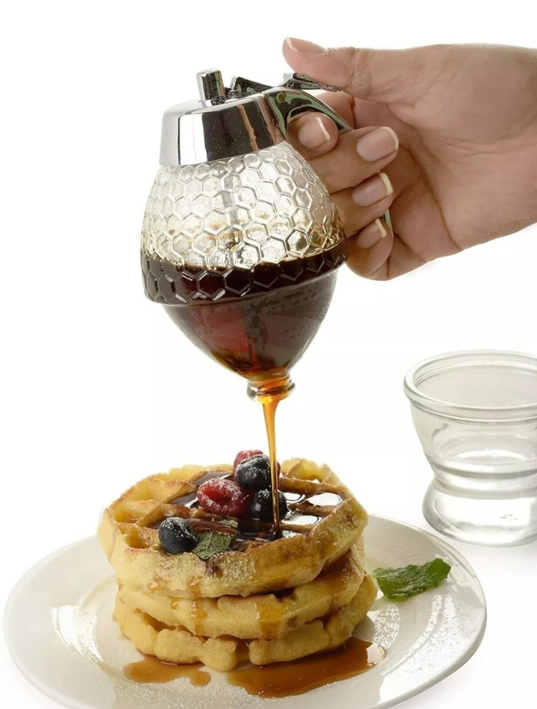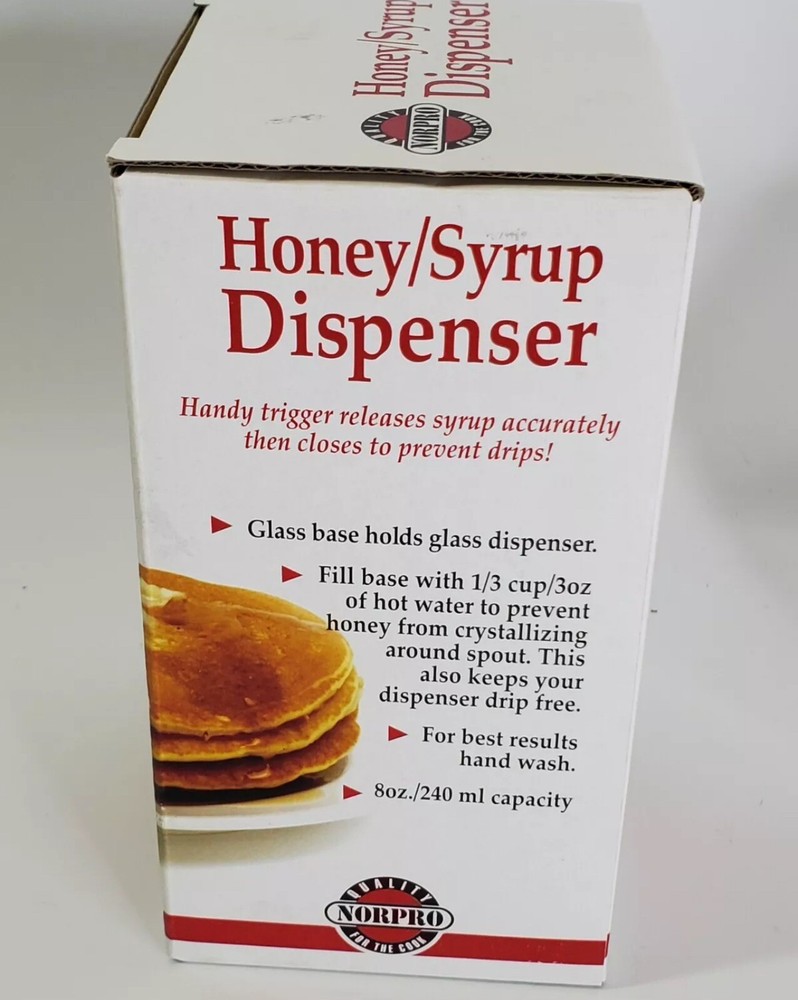 This Norpro Premium dispenser pot/jar is perfect for storing and dispensing honey syrup or other beverages. The clear glass material and bee hive pattern add a touch of elegance to any kitchen or dining area. Measuring 4.5 inches in length, 3.5 inches in width, and 6 inches in height, this unit is compact and easy to use. The dispenser pot/jar is manufactured in Taiwan and comes with an 8 ounce cap. It is a great addition to any kitchen tools and gadgets collection. Personalization is not available for this item. Get your hands on this high-quality Norpro Premium dispenser pot/jar today!