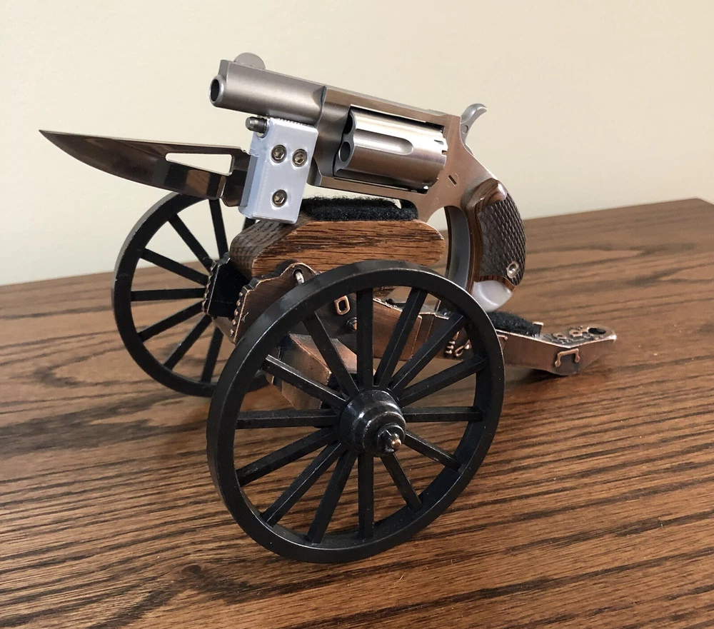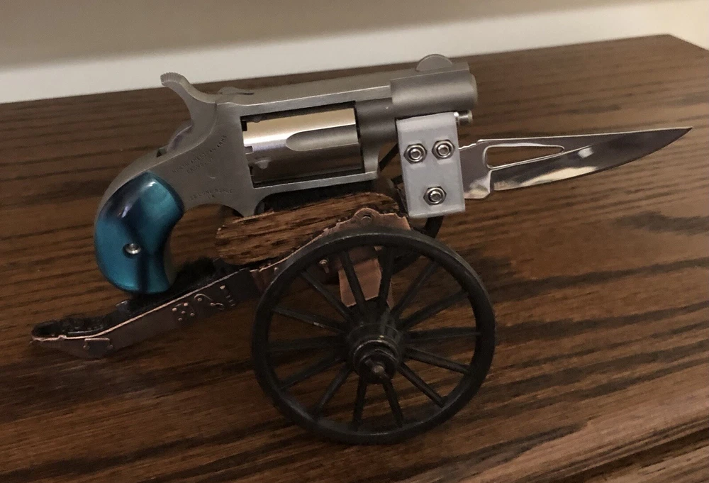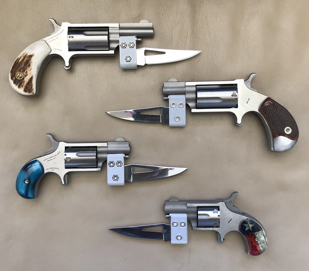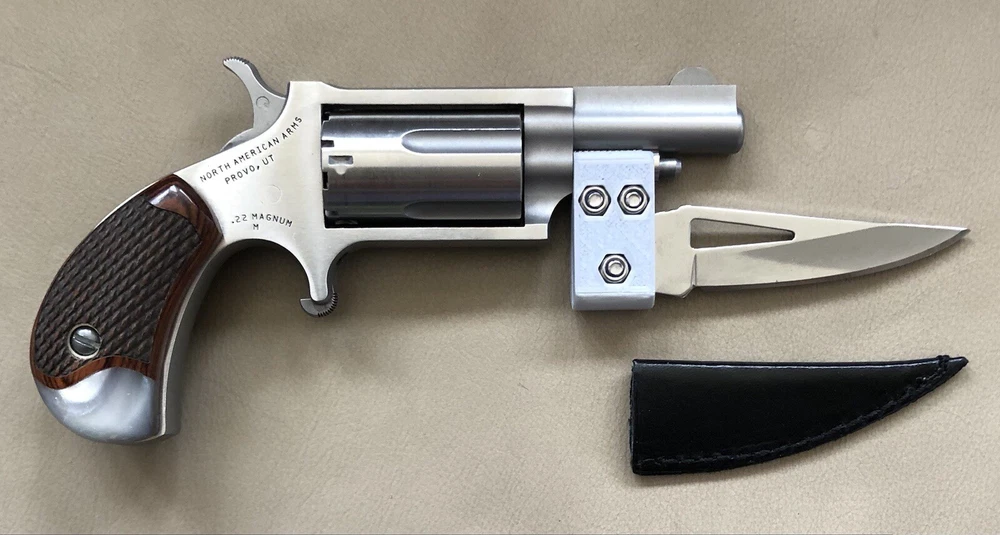 This Quality kit includes a highly engineered clamp, 2” (approximately) super sharp stainless steel blade, Hermann Oak Veg Tanned black leather sheath and a 2.5 mm Allen wrench. The bayonet kit will fit all standard minis (22 short, 22LR, 22 Mag) having a push button type cylinder rod. The clamp will not fit Wasp models due to the diameter of the rod assembly. The Bayonet makes a great addition to your NAA collection. Take a look at our listing for a hand cannon stand for your NAA. We have 3 styles, 22 LR frame stand, 22 Mag frame stand and 22 Mag frame stand with cylinder storage. We also make hand cannon display stands for Bond Arms, Cowboy 6 shot revolver, 1911s, Walther PPK and PPK/S, Kimber micro 380. See our other listings or feel free to contact us for more information. Thank you. Firearm is not included.