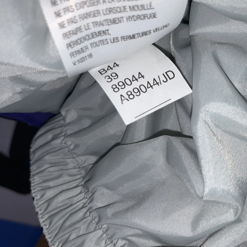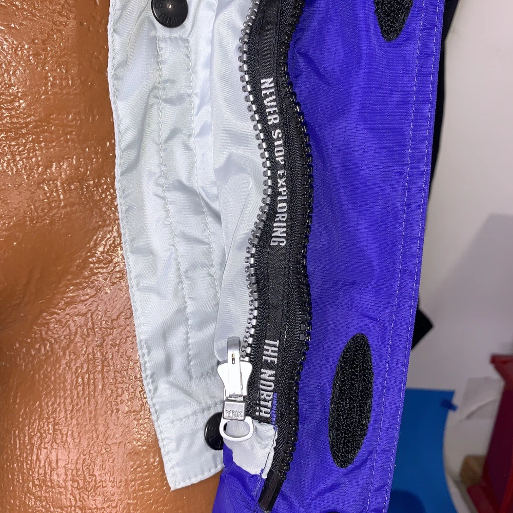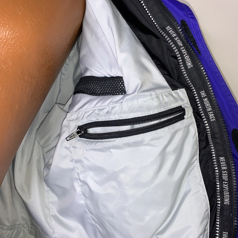 The North Face Jacket Medium Winter Ski Outer Shell Jacket Black Silver Purple Nice heavy outer shell, no inner (zippered) liner is included. (w.o liner, weighs over 2 lbs) The model and complimentary inner detachable liner info is unknown. Pre-owned. Shell only, the inner removable liner is not included. Nice condition, with working zippers, hook and loop, pulls. The zippered, detachable hood with hook and loop is included. See photos. The inner waist elastic, buttons and hook and loop all in great condition. The zippered, upper front chest is vented and good. The 2 outer zipper pockets are good.The 2 inner upper pockets are good.