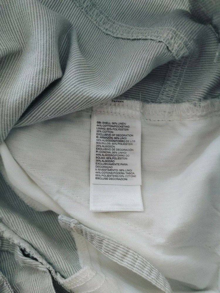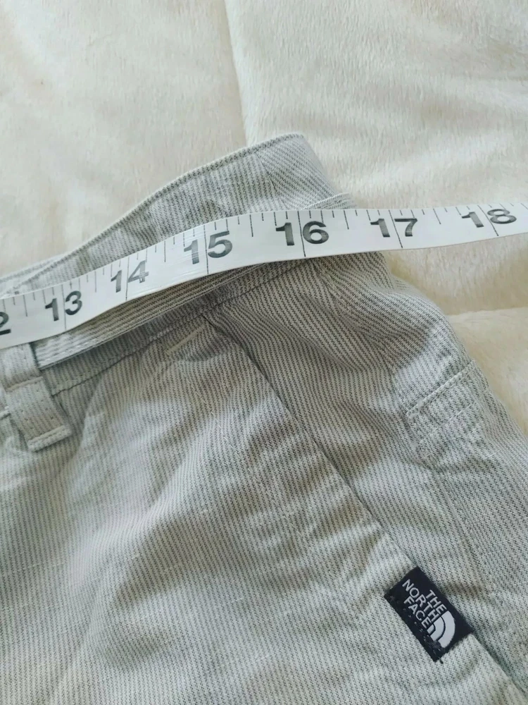 North Face Women's Shorts Grey/white Pin Stripe Linen 56% / 44% Cotton Size 8. Lining is 65% poly 35% cotton Measurements shown in photos 6" inseam 34" waist
