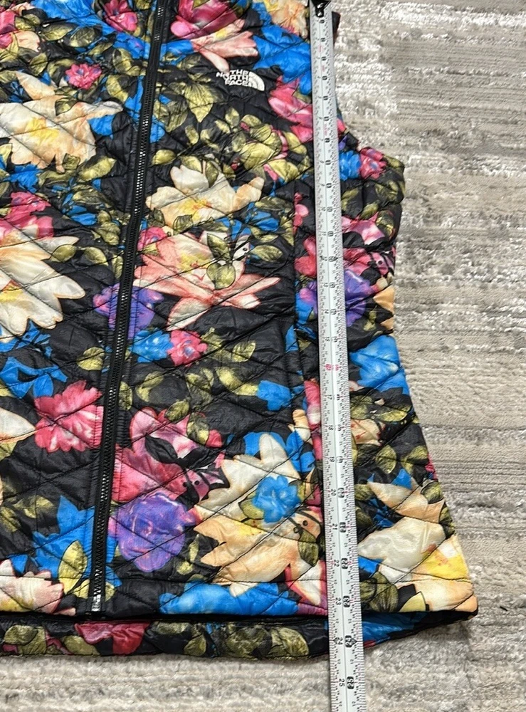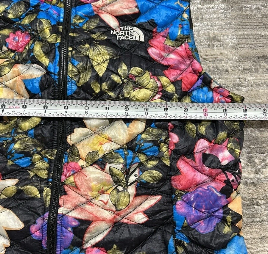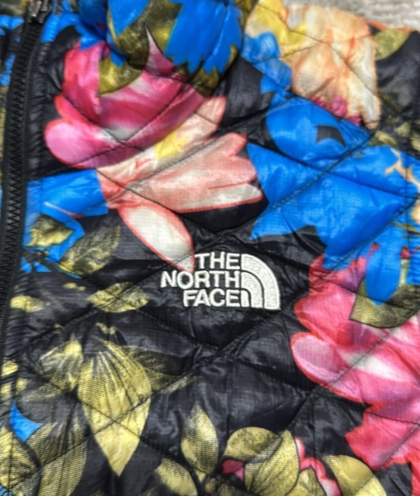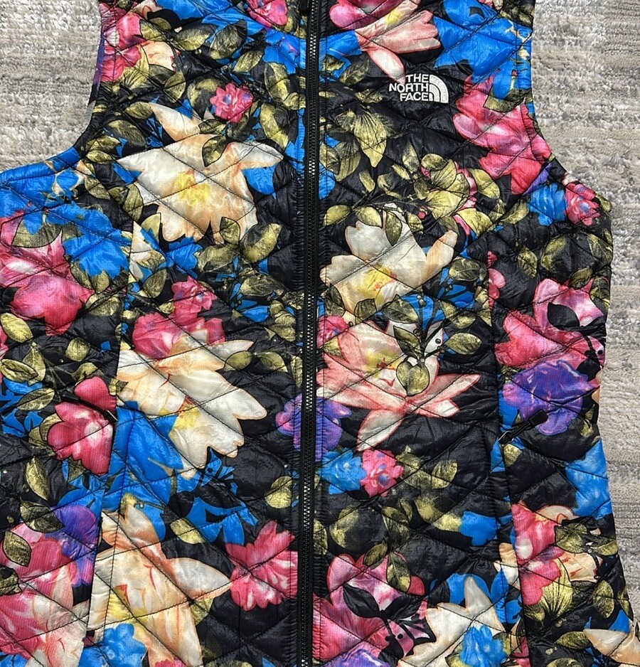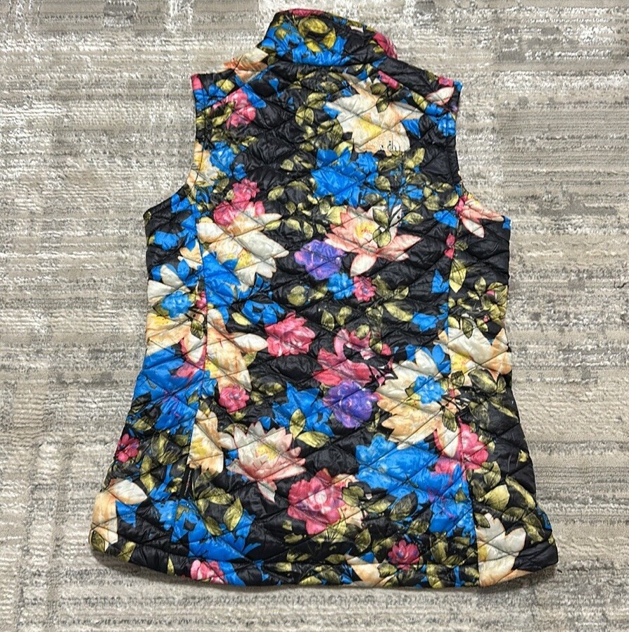 Good preowned The North Face Women’s Floral Quilted Full Zip Thermoball Vest. Vest worn a few times but still in really good condition. Shell/Lining: 100% Nylon Insulation: 100% Polyester Photos reflect condition of item. Size - S