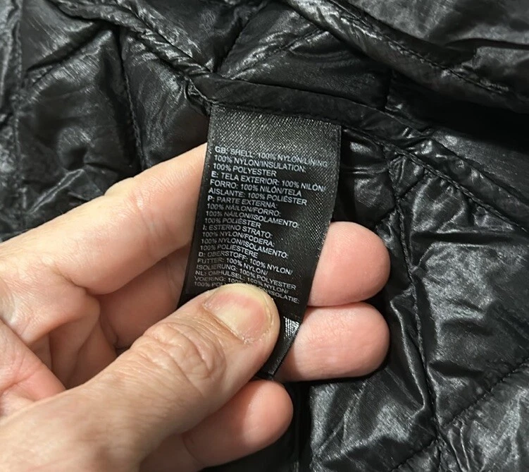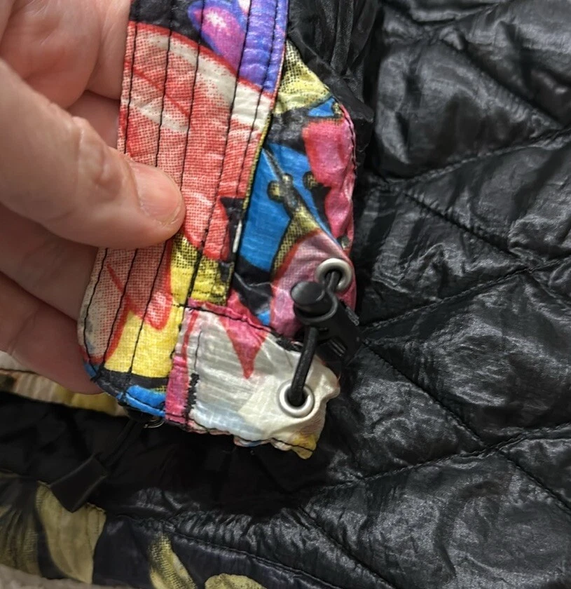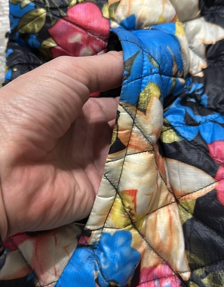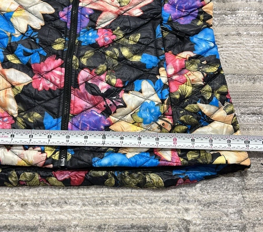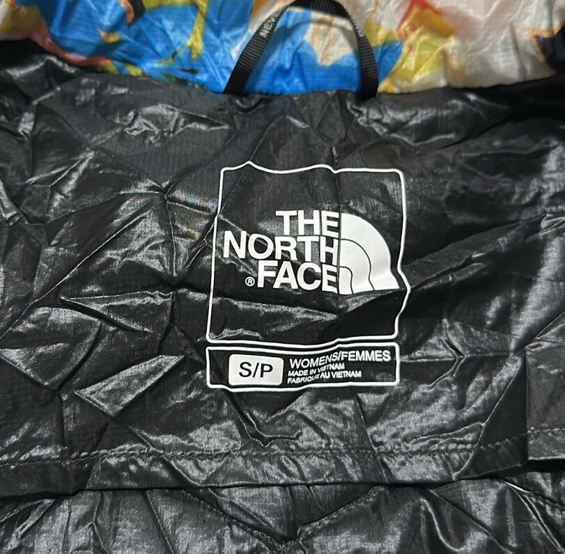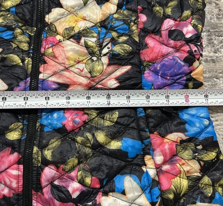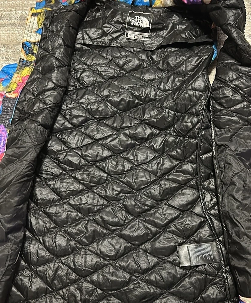 Good preowned The North Face Women’s Floral Quilted Full Zip Thermoball Vest. Vest worn a few times but still in really good condition. Shell/Lining: 100% Nylon Insulation: 100% Polyester Photos reflect condition of item. Size - S