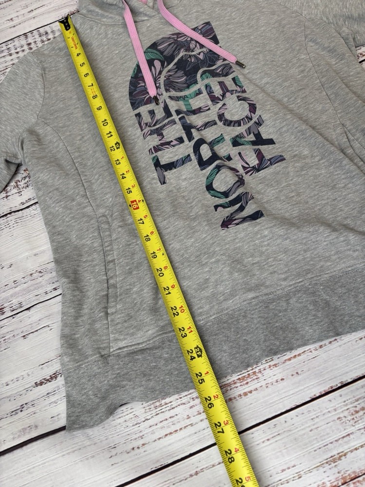 Description: Stay cozy and stylish with this North Face women’s pullover hoodie in light gray with a soft pink hood lining and drawstrings. Features a large floral print North Face logo across the front. Soft fleece interior for extra comfort. Perfect for casual days, outdoor adventures, or layering in cooler weather. ⸻ Measurements: Shown in photos ⸻ Condition: Gently used ⸻ Flaws: No noticeable flaws. ⸻ Shipping: I usually ship within 1–2 days. I offer bundle deals — message me if you’re interested in multiple items to save on shipping!