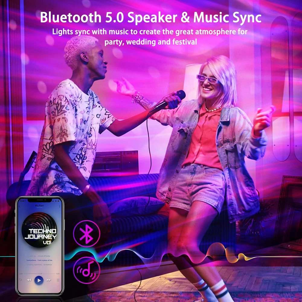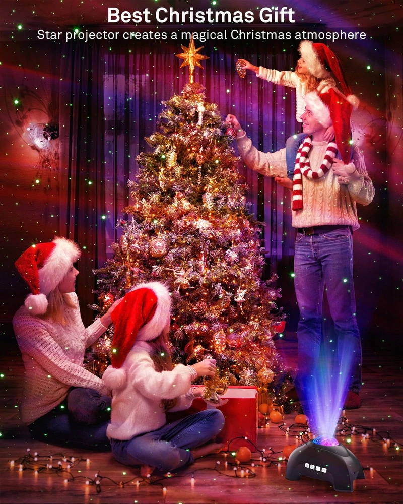 3 in 1 Aurora Light Projector - You can have both northern lights and stars working in unison or independently according to your preference. With the 4 basic aurora colors (Red, Green,Black, White), they can display by separation or combination, they can be static or moving, fast or slow, creating a miraculous ambience to your room Bluetooth Speaker & Sound activated - With the speaker built-in, our star projector can connect your devices via Bluetooth to play music and it also allow the lights projection sync with the music beat, creating a disco effect which is perfect for the party . Perfect for relaxing, and for party, bedtime story, to create all the atmosphere you need 8 White Noise & Auto Off Timer - There are 8 white noise songs on this projector, which are a varied selection of relaxing sounds, from birds tweeting and chirping through running water, soothing chimes and crackling firewood. Options built-in 1hour and 2 hours timer. and 4hours auto off timer is default setting that you can't cancel it, to bring you a convenient power saving way that you don't need to worry about forgetting to turn off the light when you fall asleep 4 Brightness & 4 Motion Speeds - 4 adjustable brightness and 4 light flow speed for your option. You can choose different level brightness according to your needs. The maximum brightness one is suitable for daytime while the minimum brightness perfect for bedtime Ideal for Adults & Kids - Star projector is suitable for birthday, party, room decor, children's day, Christmas, Anniversary. Northern lights creates a wonderful and stunning atmosphere to help children stimulate their curiosity, imagination, and creativity.Perfect for indoor decoration as a romantic mood light, night lamp and bedside lamp