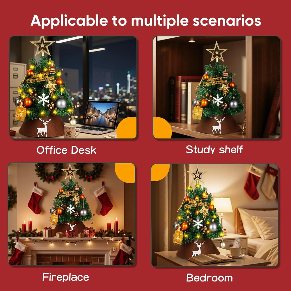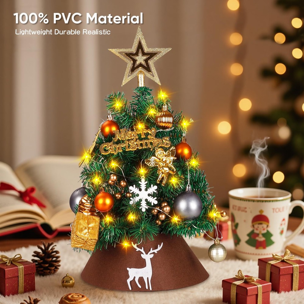 24 Inch Tabletop Christmas Tree, Artificial Mini Xmas Pine Tree with 30 LED String Lights,Small Xmas Star Tree for Christmas Decor Perfect Tabletop Size – 60 cm / 23.6 in tall with 75 branch tips across 8 graduated tiers plus a crowning top branch; slim 35 cm / 13.8 in Ø footprint fits desks, mantels, dorms and entryways. Heavy-Duty Construction – built on a 7.8 mm thick steel pole for upright stability season after season; flame-retardant PVC needles offer lifelike color and zero shedding. Deluxe Ornament Kit – arrives complete with 1.6 m grey-kraft ribbon, 15 cm tree-top star, 14.5 cm gold “Merry Christmas” plaque, white deer head, golden reindeer & angel, 5 white snowflakes, 2 gift boxes, 9 golden berry picks, 21 mixed-matte & shiny baubles (6 cm & 4 cm), mini burlap sack and a 3 m 30-LED warm-white battery string. Tool-Free Setup & Storage – hinged branches drop into place in minutes; everything tucks back into the reusable box for compact off-season storage. Safe & Versatile Décor – UL-certified light set, low-heat LEDs and sturdy metal base make it ideal for indoor or covered-porch use; a charming gift or centerpiece for Christmas, weddings and winter parties.