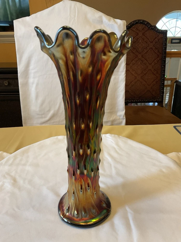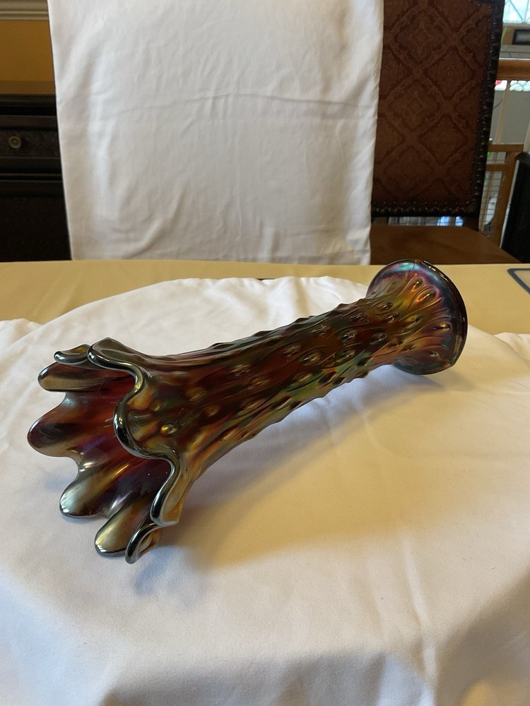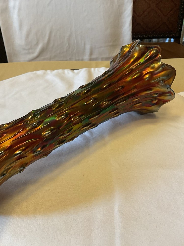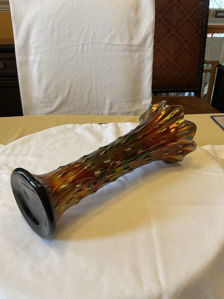 The Northwood Tree Trunk Carnival Glass Vase is a medium-sized vintage piece with a unique Tree Trunk pattern. Made of glass with an iridescent electric amethyst finish, this art nouveau style vase is a beautiful addition to any collection. The Tree Trunk design adds a whimsical touch to the decor, making it a standout piece for any home.