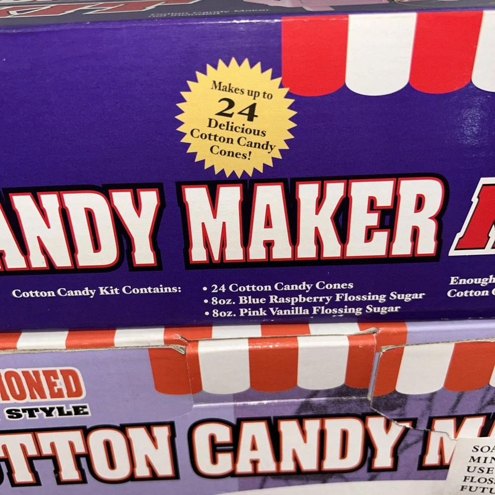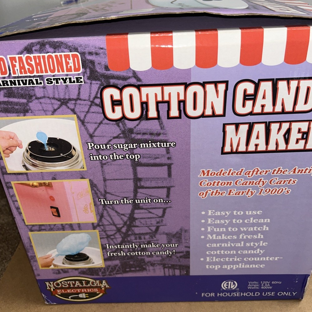 The Nostalgia CCM505 Cotton Candy Maker is a vintage-inspired carnival style appliance that brings back memories of nostalgic old-fashioned fun. With its retro design and model name (CCM-505), it exudes charm and whimsy, perfect for creating delicious cotton candy at home. The Nostalgia Electrics brand ensures high-quality and reliable performance, making this cotton candy maker a delightful addition to any kitchen or sweet treats enthusiast's collection. Comes with add on cotton candy maker kit that makes 24 delicious cotton candy cones.box opened but product appears to never have been removed from packaging.