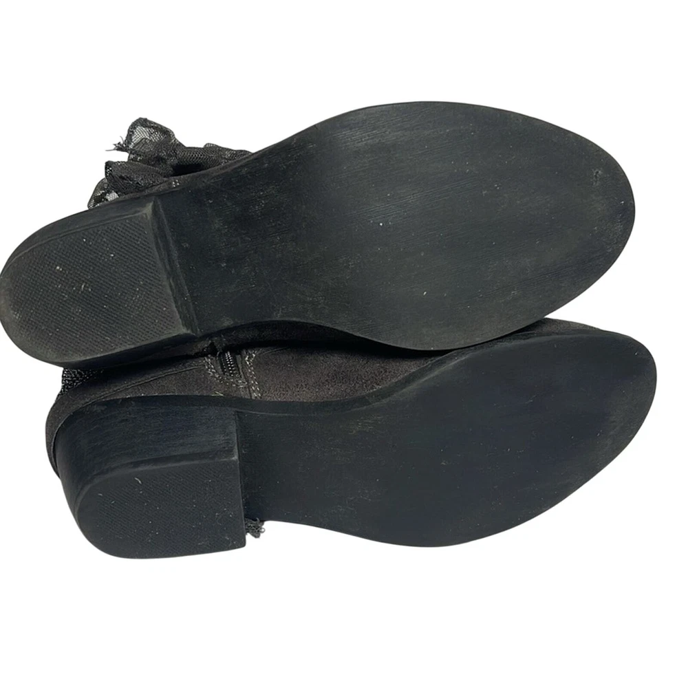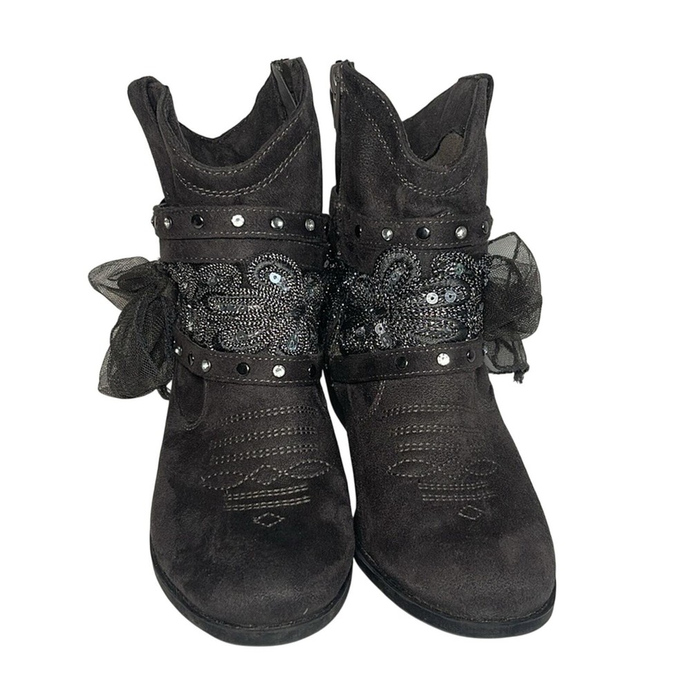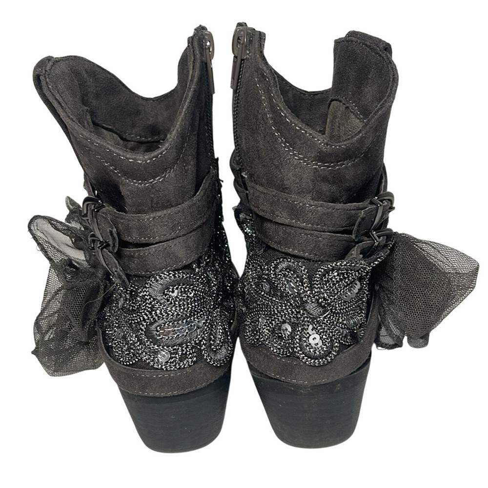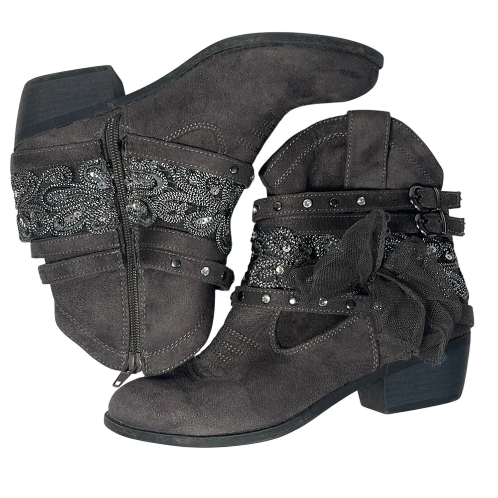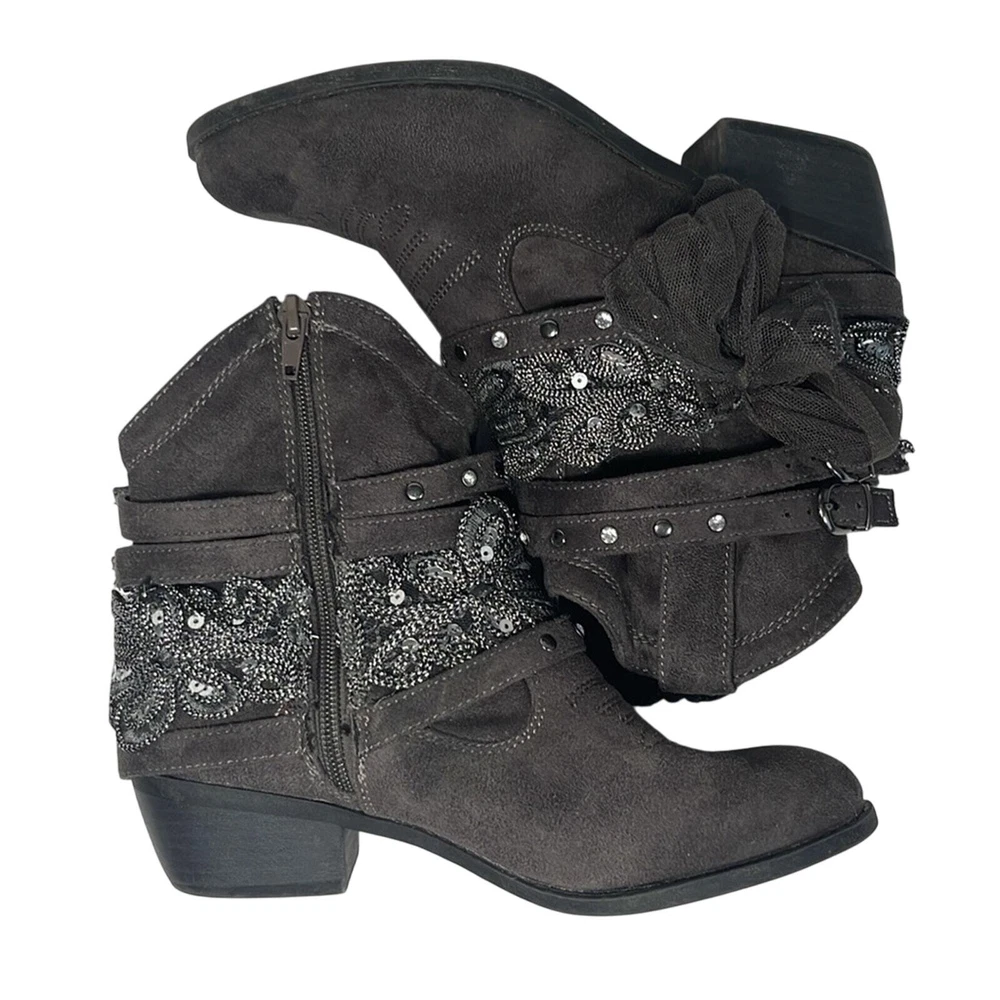 Not Rated Midas Gray Embellished Cowgirl Boots - Women's Size 6 - Good preowned condition, gently worn - Studded and beaded straps - Lace bow - 1-1/2 inch heel Coastal cowgirl, western, Cowgirl glam, rodeo ready, cowgirl boots, rodeo outfit