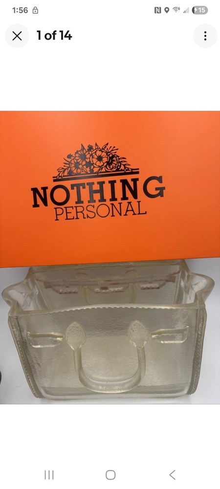 The product is a clear flower vase designed by the brand Nothing Personal, featuring a sleek and elegant design perfect for displaying flowers or as a decorative piece. The vase's minimalist aesthetic is enhanced by the use of a clear color, making it versatile and easy to match with various decor styles. With a unique design inspired by the Hermes Birkin bag, this vase adds a touch of luxury and sophistication to any space. Ideal for collectors or those looking to add a touch of elegance to their home decor.