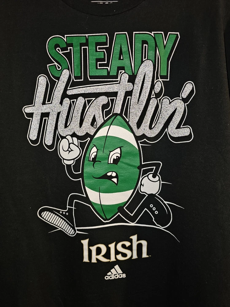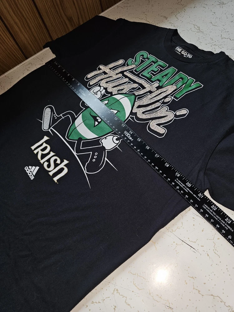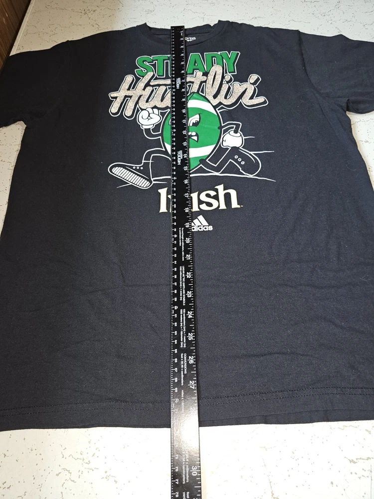 Show your support for the Notre Dame Fighting Irish with this stylish black graphic logo t-shirt. Made by adidas, this shirt is perfect for regular season football games and is officially licensed by the NCAA. The shirt is available in size L and is designed for men. The shirt is made in Honduras and features the iconic Notre Dame logo on the front. Whether you're a student or an alumnus, this t-shirt is a great way to show your pride for the Fighting Irish. It's perfect for casual wear or game day, and the high-quality design ensures it will last for years to come. Get yours today and show your love for ND!