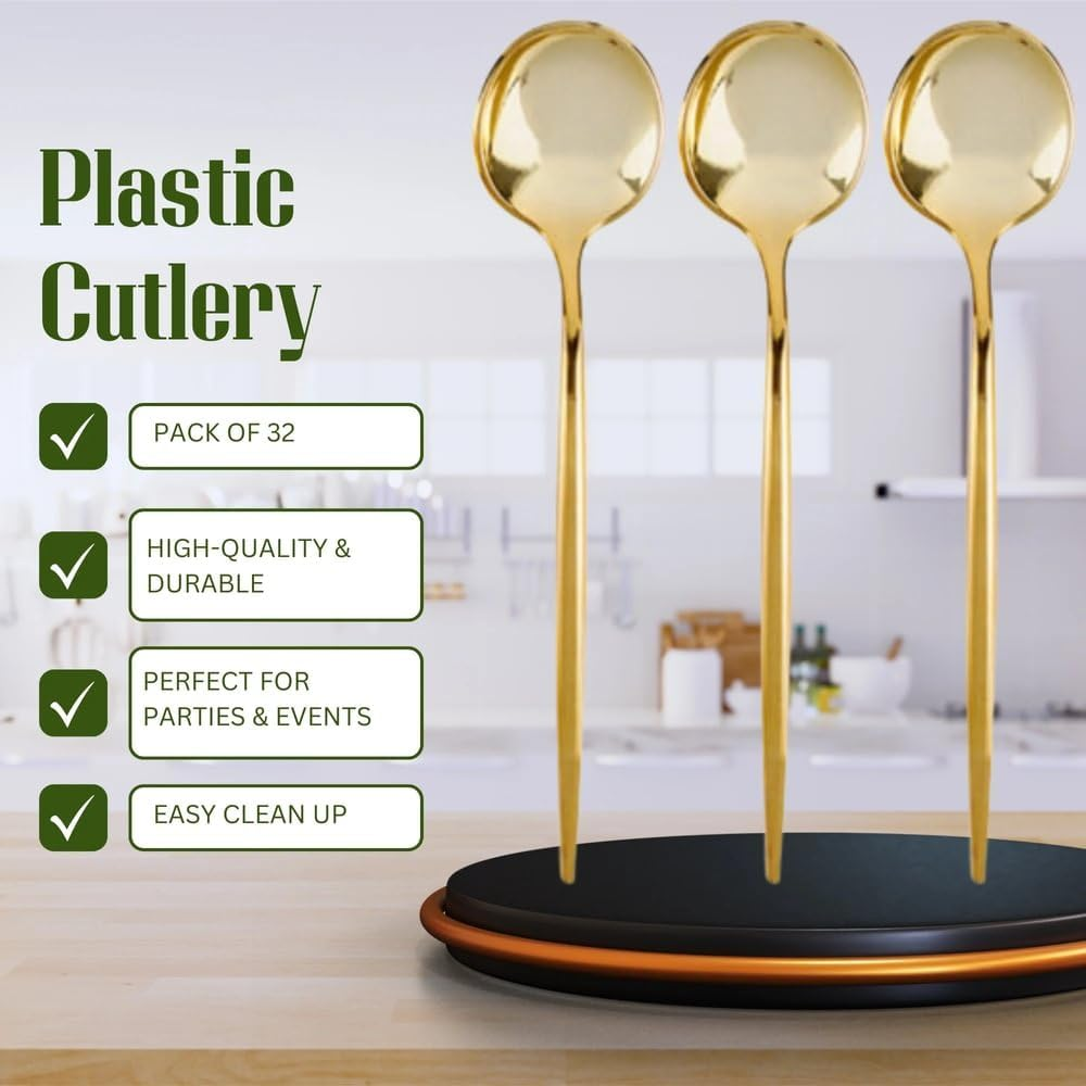 LUXURIOUS DESIGN: Elevate your table setting with these Novelty Flatware Gold Teaspoons - a modern and stylish addition to any party, gathering, or event. Their eye-catching golden shimmer and sophisticated shape are sure to impress your guests and make a lasting impression. SUPERIOR QUALITY: Boasting durable and premium-grade plastic construction, our 32-count gold teaspoons not only offer an upscale and luxurious look but also guarantee longevity – ensuring that every scoop is as enjoyable as the first one. COMPLETE SET: Never run out of teaspoons for your dining needs! This generous 32-count pack allows you to serve a large number of guests, making them ideal for weddings, banquets, family gatherings, or corporate events. VERSATILE & PRACTICAL: Perfect for a variety of occasions, these gold teaspoons can effortlessly blend in with both casual and formal table settings, enhancing your dining experience without breaking the bank. Enjoy their multi-purpose use at holiday dinners, baby showers, or even intimate family meals. EFFORTLESS CLEAN-UP: Designed for convenience, our disposable gold teaspoons take the hassle out of post-event clean-up. Simply toss them away after use – leaving you with more time to make sweet memories with your loved ones. Order your Novelty Flatware Gold Teaspoons today and add a touch of elegance to your next occasion! Our novelty teaspoons will give every dining experience an artistic vibe!