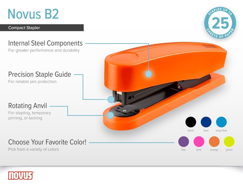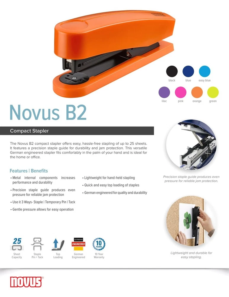 Novus B2 Compact Stapler, 25 Sheet Capacity, Precision Staple Guide, German E...