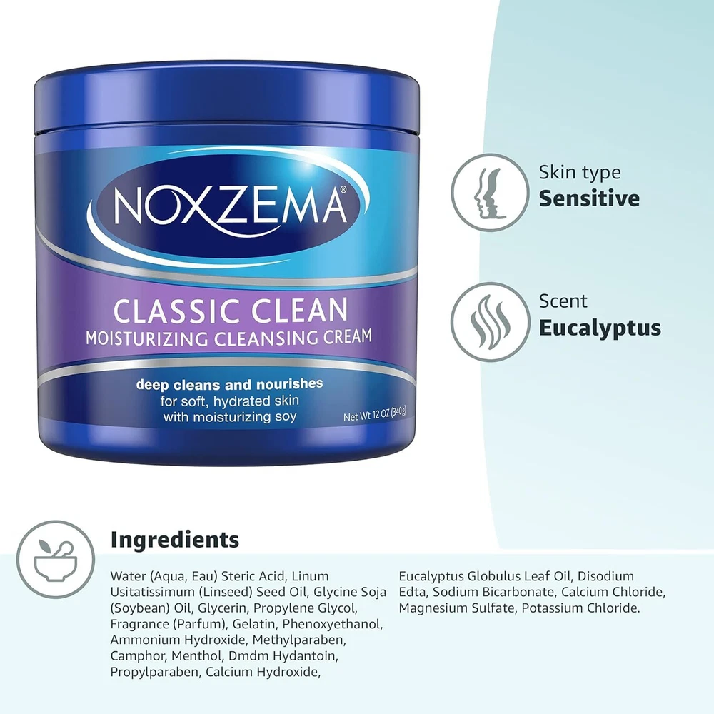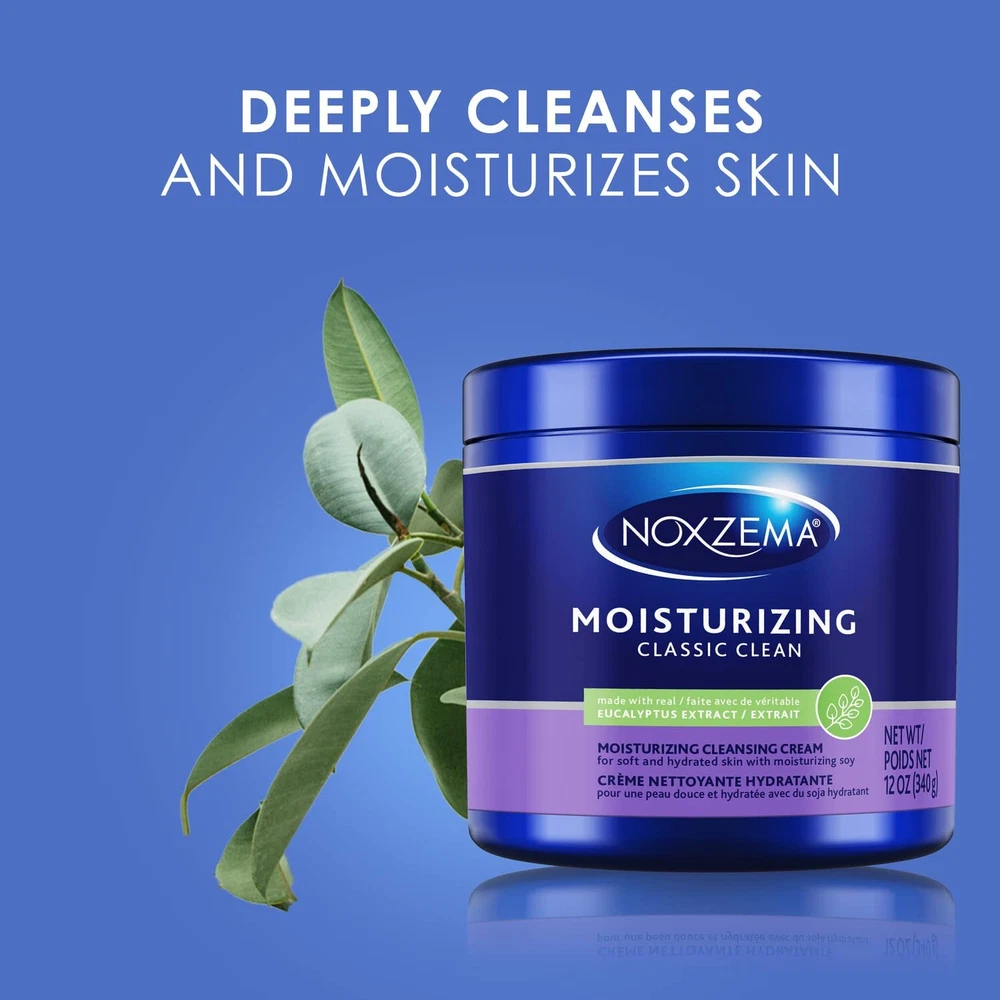 Product Description Noxzema Classic Moisturizing Facial Cleanser Cream, With Real Eucalyptus Extract, For All Skin, 12 Ounce (Pack Of 2) Noxzema Classic Clean Moisturizing Cleansing Cream, you’ll experience clean, smooth skin, and the classic refreshing Noxzema tingle. In addition to being an effective face cleanser, this moisturizing cream adds a dose of moisture to invigorate your skin. This moisturizing cleansing cream cleans deeply, removing oil, dirt, and makeup to leave your skin soft, while the additional moisturizers keep skin from over drying. The perfect addition to your skin care routine, Noxzema Classic Clean Moisturizing Cleansing Cream is dermatologist-tested and made with eucalyptus, soybean, and linseed oils. This Noxzema Classic Clean Moisturizing Cleansing Cream is also a highly effective makeup remover. How to use: On a wet or dry face, apply generously. MOISTURIZING FACE CLEANSER: Noxzema Moisturizing Cleansing Cream cleans deeply, removing oil, dirt, and makeup to leave your skin soft, while the additional moisturizers keep skin from over drying. SOFT & SMOOTH SKIN: With Noxzema Classic Clean Moisturizing Cleanser you’ll experience clean, smooth skin, the classic Noxzema tingle, and an added dose of moisture. MADE WITH REAL EUCALYPTUS EXTRACT: Made with eucalyptus, soybean, and linseed oils, this dermatologist-tested face cleanser provides a deep clean and moisturizes for soft and hydrated skin. THE SIGNATURE NOXZEMA TINGLE: Eucalyptus oil and Menthol adds the signature Noxzema refreshing tingle to your skin care routine. HOW TO USE: Apply this moisturizing cream generously on a wet or dry face. With fingertips or a wet washcloth, gently massage your face using a circular motion. Rinse thoroughly. THE NOXZEMA DIFFERENCE: Experience the Noxzema difference with skin care products that give your skin an invigorating fresh start. Removes dirt and oil Deep cleans with adding moisture Dermatologist Tested Leaves Skin smooth Conditions Skin With Added Moisturizers Ingredients Water (Aqua, Eau) Steric Acid, Linum Usitatissimum (Linseed) Seed Oil, Glycine Soja (Soybean) Oil, Glycerin, Propylene Glycol, Phenoxyethanol, Gelatin, Fragrance (Parfum), Ammonium Hydroxide, Methylparaben, Camphor, Eucalyptus Globulus Leaf Oil, Propylparaben, Calcium Hydroxide, Menthol, Disodium EDTA, Sodium Bicarbonate, Calcium Chloride, Magnesium Sulfate, Potassium Chloride, Benzyl Benzoate, Eugenol, Geraniol, Limonene, Linalool.