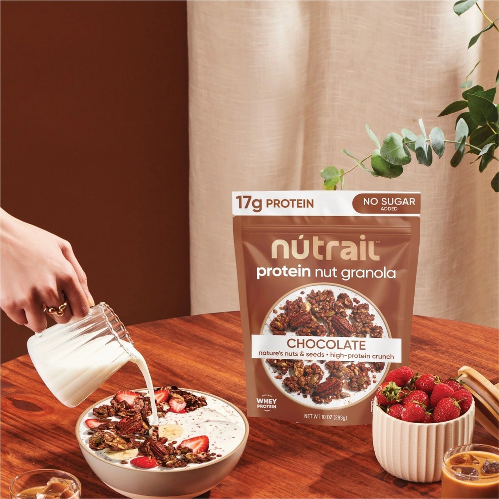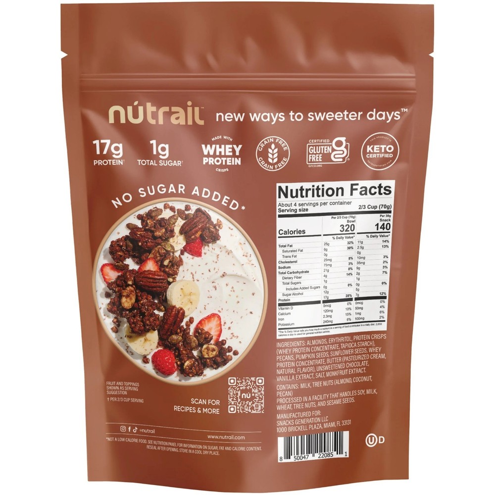 NuTrail 17g Protein Nut Granola Cereal, Chocolate, Healthy Breakfast 10 oz. 1 Count. Item description from the seller: Our Chocolate nut protein granola , No Sugar Added , takes our Nut Granola to the next level ,with added essential protein crisps. Packed with 17g of protein and 1g sugar, this granola offers the invigorating flavor, crunch, and lasting energy you’re looking for. You can take this on the go to fuel up between meals, have it as breakfast, with a bowl of your preferred milk, or use it to dress up your favorite dessert. This 10oz bag of wholesome nutrition ,is perfect for adventuring, relaxing, recharging, or just straight up indulging. At NuTrail, we love meticulously crafting the best high quality, low sugar experiences for you. Treat yourself to a nourishing treat , you deserve it. Chocolate Protein Granola gives you energy ,that lasts all day log with 17g of protein per 2/3 cup serving. 17g protein nut granola ,with no artificial flavors, dyes, or sweeteners. Perfect crunchy smoothie topper, with milk for breakfast, or by the handful.