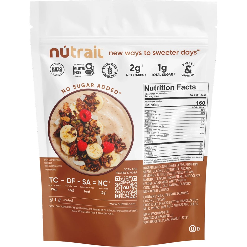 NuTrail Nut granola Cereal, dark Chocolate, No Sugar added, 11 oz...(FREE & FAST SHIPPING) Product details: This one’s for our chocolate lovers! Low-sugar, Low-carb as always . So No Worries There. Our Signature Blend of Nuts and Seeds, Paired with Unsweetened Chocolate and Naturally Sweet Monk Fruit. A Perfect Pair For Your Favorite Nut Butter or a Healthy Topping For Your Favorite Dessert – You Really Can’t Go Wrong. DELICIOUS HEALTHY NUT GRANOLA : a no Sugar added, Gluten-Free, Grain-Free, Non-GMO, Keto and Kosher Certified, only 1-3g Net Carbs per serving. NO WRONG WAY TO LOVE US : Enjoy our Granola with Milk as a Low-Carb, Low-Sugar, Keto Cereal, Atop your Favorite Smoothie or Parfait, or Straight Out of the Bag! SWEET OR SAVORY : Whether you’re Making Dinner or Dessert our Low-Sugar, Low-Carb Nut Granola Adapts to Your Needs. ON-THE-GO : Our Low-Sugar, Low-Carb, Non-GMO, Keto Granola is Perfect For Your Busy Lifestyle. It can be a Snack or a filling meal sure to satisfy your cravings. WE'VE BEEN CALLED : Best In Class Granola, Low Carb granola, Gluten Free Certified granola, Low Carb Snack, Low Sugar Snack Nutrition facts Refer to the product label for full dietary information, which may be available as an alternative product image. 10 Servings Per Container Serving Size 1/3 cup (30g) Amount per serving Amount per serving % Daily Value* Total Fat 18% Saturated Fat 5g Trans Fat 0g Cholesterol 5.0mg Sodium 25mg Total Carbohydrate 9g Dietary Fiber 3g 11% Sugars 1g 0% Sugar Alcohol 4.0g Calcium 0.0mg Potassium 160mg Iron 1.2mg Vitamin D 0.0mcg * The % Daily Value (DV) tells you how much a nutrient in a serving of food contributes to a daily diet. Calories per gram:Fat 9 • Carbohydrate 4 • Protein 4 More details Nutrient Content Claims Low-Carb, Wheat-Free, No Sugar Added, Grain-Free, Gluten-Free Nut Type Pecans, Almonds Flavor Cacao Size 9.25x7x3 Food Condition Shelf-Stable Food Form Granules Container Type Bag Container Material Plastic Ingredients Sunflower Seeds, Pumpkin Seeds, Coconut, Erythritol, Pecans, Almonds, Butter (Pasteurized Cream, Natural Flavor), Unsweetened Chocolate (from Cacao Nibs), Whey Protein Concentrate, Salt, Natural Flavors, Monkfruit Extract. Active Ingredient Name Sunflower Seeds, Pumpkin Seeds, Coconut, Erythritol, Pecans, Almonds, Butter (Pasteurized Cream, Natural Flavor), Unsweetened Chocolate (from Cacao Nibs), Whey Protein Concentrate, Salt, Natural Flavors, Monkfruit Extract.
