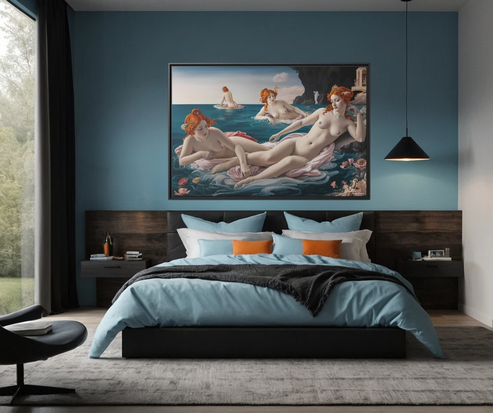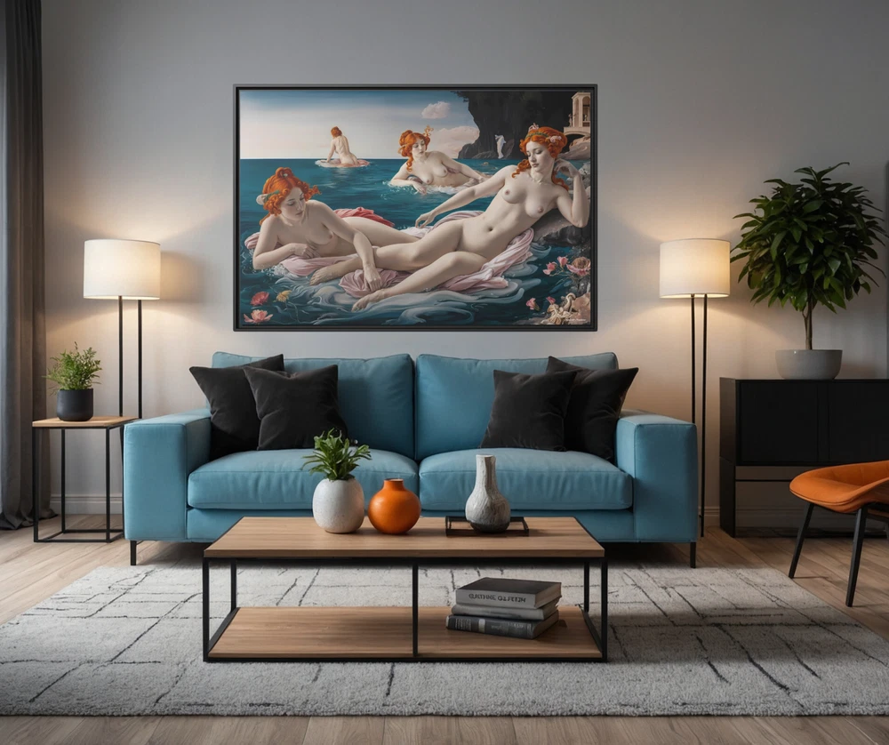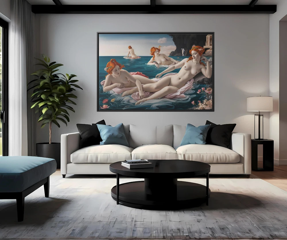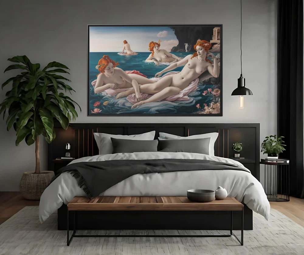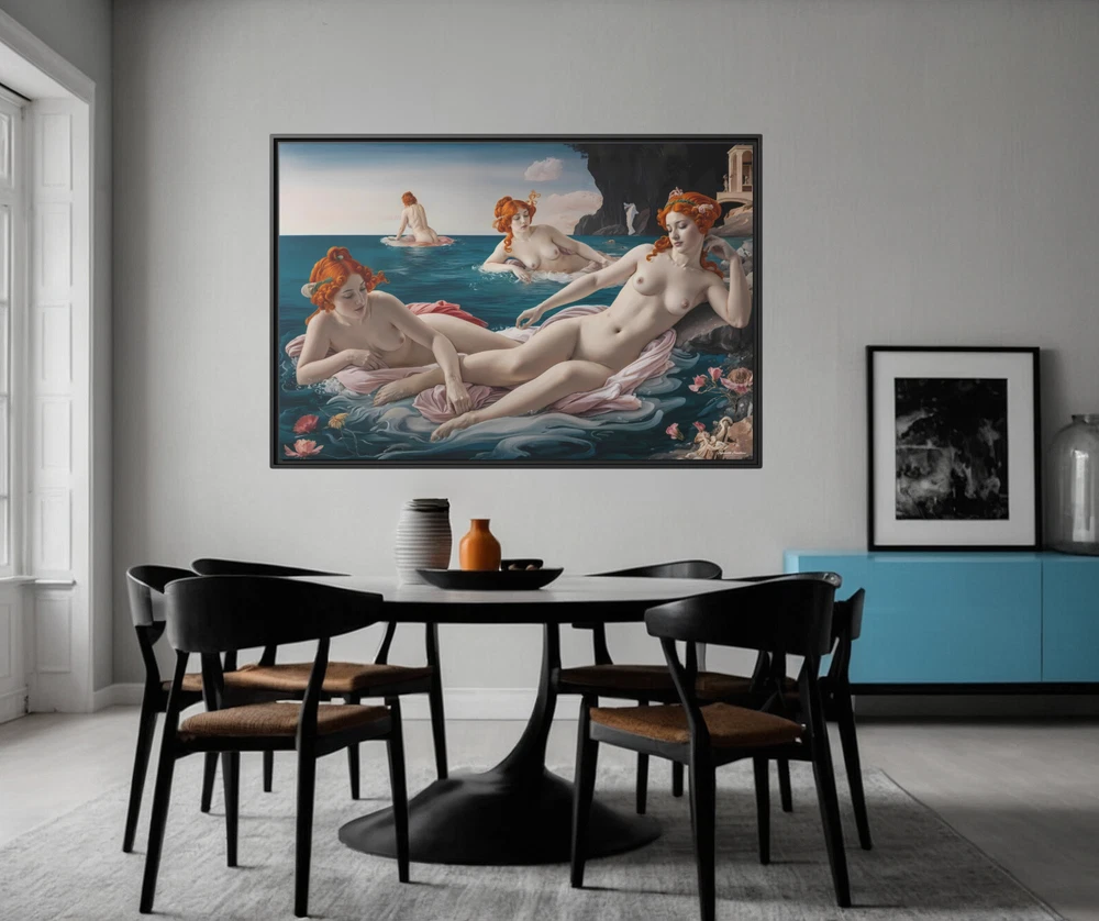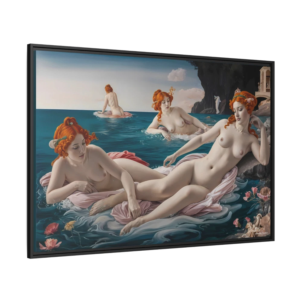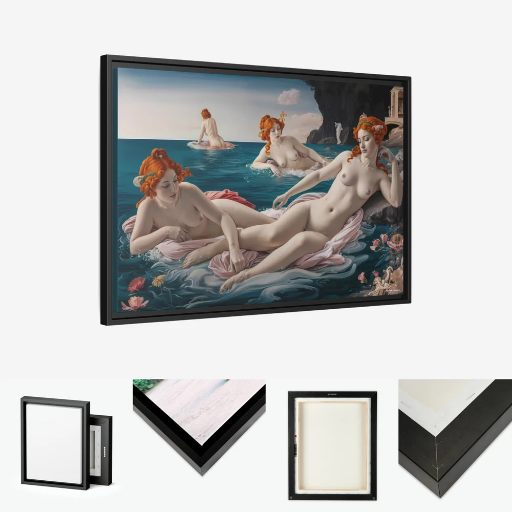 "Bathing Maidens" by Hypnotik Creations – Licensed Reproduction Product Description: Transform your space with the timeless elegance of "Bathing Maidens" , an illustrative licensed reproduction by Hypnotik Creations. This exquisite acrylic painting imitation draws inspiration from the iconic style of Sandro Botticelli , featuring a serene scene of women bathing in the sea. The intricate detailing, soft textures, and harmonious composition evoke the classic beauty of Renaissance art while being reimagined in a modern illustrative form. Expertly printed on museum-quality cotton-polyester composite gallery wrapped canvas , this artwork ensures vibrant, long-lasting colors with its proprietary matte finish coating . Utilizing UL-certified Greenguard Gold inks —which are non-hazardous, non-toxic, and non-flammable—this piece offers unparalleled image clarity and eco-conscious production. Encased in a 1.25" solid pine wood floating frame , available in black, the artwork achieves a refined, dimensional look that enhances any interior decor. The frame is crafted from sustainably sourced, FSC-certified materials , making it an eco-friendly choice. It arrives ready to hang , with sawtooth hanging hardware pre-installed , ensuring effortless setup. Please note: Due to the production process, slight size deviations (+/- 1/8" or 3.2mm) may occur. Maintenance is easy—simply wipe gently with a clean, damp cloth if needed. Key Features: Licensed Reproduction: A modern reinterpretation of Sandro Botticelli's style, featuring serene bathing maidens in a beautifully illustrative acrylic painting imitation. Premium Canvas Printing: Expertly printed on museum-quality cotton-polyester composite gallery wrapped canvas with a proprietary matte finish coating for vibrant and long-lasting colors. Eco-Friendly Inks: Produced using UL-certified Greenguard Gold latex inks , which are non-toxic, non-flammable, and environmentally safe. Elegant Floating Frame: Framed in a 1.25" solid pine wood frame available in black, creating a sophisticated floating effect. Sustainably Sourced Materials: Made with FSC-certified materials , ensuring an eco-friendly and sustainable design. Ready to Hang: Comes pre-assembled with sawtooth hanging hardware, ready to display out of the box. Easy Maintenance: Wipe gently with a clean, damp cloth to maintain its pristine condition. Slight Size Tolerance: Expect a minor size variation of +/- 1/8" (3.2mm) due to the production process. Size Options: 30x20, 36x24 & 48x32. Perfect for art enthusiasts and lovers of Renaissance-inspired beauty, "Bathing Maidens" by Hypnotik Creations makes a stunning centerpiece, blending classical art with modern craftsmanship to enrich any living space. * Shipping to Alaska, Hawaii, and unincorporated territories of the United States can take additional 7 ? 12 business days, weather permitting.