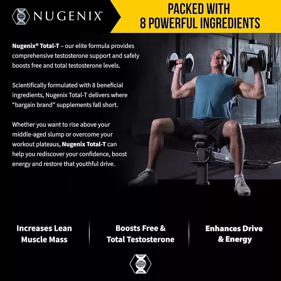 Nugenix Total-T Testosterone Booster 90 Capsules Free ship Expiry 05/2025 Flavor Unflavored Primary Supplement Type Testofen Unit Count 90.00 Count Item Form Capsule Item dimensions L x W x H 3.2 x 3.2 x 5.6 inches Special Ingredients LCitrulline Malate Diet Type Gluten Free Product Benefits Energy Management Age Range (Description) Adult About this item Scientifically formulated, our new-and-improved compound helps increase lean muscle mass, and boost free & total testosterone levels Our elite men's supplement is specially designed to help men 40 and older reach their full potential by safely boosting testosterone levels Ingredients in Nugenix Total-T have been clinically shown to deliver more powerful, comprehensive testosterone support where others fall short, without using any stimulants or unnecessary fillers This potent, one-of-a-kind, testosterone-boosting formula helps you maintain your youthful edge as you age