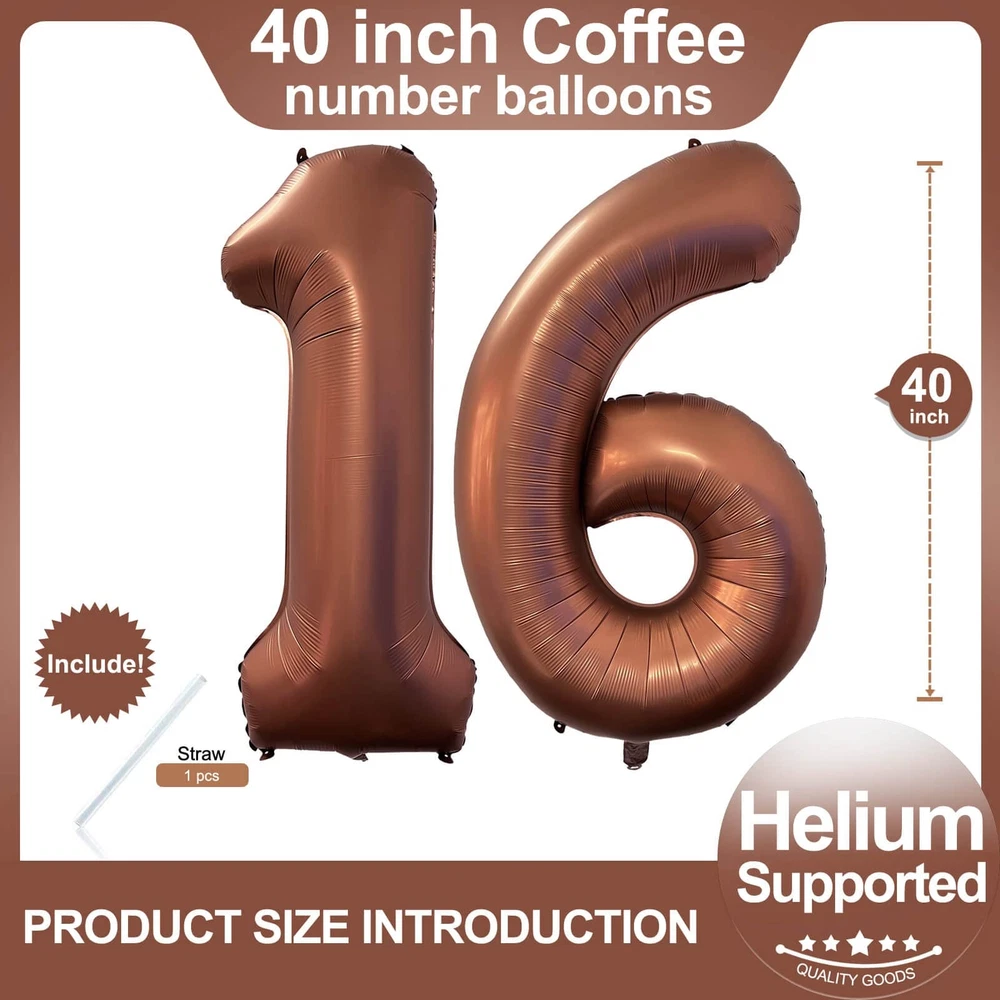 Number 16 Coffee Brown Balloons 40 Inch Giant Retro Coffee 16 Numer Foil Helium Balloons for 16th 61st Birthday Party Supplies 16th Anniversary Events Decorations Color:Coffee Brown Packaged included:1 piece 40 inch Coffee Brown Number 1 and 6 balloon,1 straw to inflate. Coffee Brown 16 number foil balloons are the best for 16th birthday party, 16th wedding celebration, anniversary, ceremories celebration, business or big events party.Coffee Brown Sweet Birthday 16 Numbers balloons are perfect for birthday or anniversary party decorations. The jumbo design makes it wonderful backdrop in any occasions.Not only can create happy feelings for the party, but also allow you to take memorable pictures.You can DIY with other latex or foil balloons,makes your party more charming and impressive How to use:you can stick Coffee Brown 16 number balloons on the wall, window or door, you can inflate with both helium or air, you can even place them on the bed, floor or table, provide your party or home a good decoration. Package Included:40 inch Coffee Brown numbers 1 and 6 (uninflated) + 1 Straw,Coffee Brown 16 or 61 number foil digital balloons are the best for 16th or 61st birthday party,wedding celebration, anniversary, ceremories celebration, business or big events party. Material: Number Balloons made with high quality aluminum foil., not easy to explode and leak, bright colors, full of numbers. How To Use:Infalted with helium or air with pumb or straw slowy to 90% enough,you can stick number balloons on the wall, window or door,or string with helium balloons Suitable:The giant foil numbers balloons is helium supported,classy quality number balloons are perfect for birthday party, anniversary,wedding,New years,baby shower,graduations decorations.You can take memorable photos.You can also DIY with other latex or foil balloons,makes your party more charming and impressive Shipping from the USA All of our products are shipped from the USA, ensuring quick delivery to your destination. Payment We offer the following payment methods: PayPal, credit card, bank transfer, and eBay's secure payment system. Free Shipping & Free Returns Shipping within the USA is FREE. Additionally, any return is absolutely free for you. Risk-Free Purchase You have the option to return an item within 30 days without any justification. We cover the return shipping costs! Fast Shipping We ship immediately upon receipt of payment. Generally, the package is delivered within 2-3 days in the USA. If it takes longer, we will contact you. Quality and Costs Made in Europe, USA, China No customs fees or additional charges Total satisfaction guarantee Invoice with declared VAT available upon request in .pdf format Feedback Your feedback is very important to us. After you pay for your purchase, you will automatically receive positive feedback from us.