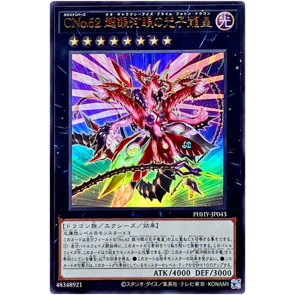 Item Discription PHHY-JP043 Number C62: Neo Galaxy-Eyes Prime Photon Dragon Front Back Card Name : Number C62: Neo Galaxy-Eyes Prime Photon Dragon Character : Number C62: Neo Galaxy-Eyes Prime Photon Dragon Rarity : Ultra Rare Card Number : PHHY-JP043 Set : Photon Hypernova Type : Effect Xyz Monster Language : Japanese Card Condition : Near Mint Purchased cards will be clipped with cardboard, waterproofed, and shipped without any scratches or folds. Cards over $20 will be packed even tighter with a loader for each card. Shipping Policy Free shipping worldwide. Free shipping does not include tracking. There is an additional cost of US $4 for tracking. If you purchase cards totaling US $30 or more, you will receive a free tracking number. All of the products will be shipped from Japan. Economy Shipping Air mail ( no tracking ) Free Shipping Delivery time : About 2-4 weeks Standard Shipping Air mail ( with tracking ) US $4 Delivery time : About 2-4 weeks Expedited Shipping FedEx or EMS or DHL ( with tracking ) US $24 Delivery time : About 1-2 weeks Payment Policy We accept all major credit cards and Paypal payments. Return Policy We hope you will love your purchase, houever if you need to return it, we have a 30 day return policy. International Buyers Import duties, taxes, and charges are not included in the item price or shipping cost. These charges are the buyerʼs responsibility. Please check with your countryʼs customs office to determine what these additional costs will be prior to bidding or buying. If the cancellation is due to the buyer, wewill charge a fee. If there is a remote charge for your address, we will charge you for additional shipping. We are honored to receive the eBay Japan Awards 2022! I am thrilled to share that my store has won the eBay Japan Awards 2022 ! This amazing accomplishment wouldnʼt have been possible without our wonderful customers. A heartfelt thank you for your ongoing support. We will continue to improve our services, offering a diverse selection of items and top-notch customer care Thank you for helping us achieve this prestigous recognition, and we look forward to serving you in the future! Copyright ©️ 2023 Animart Japan