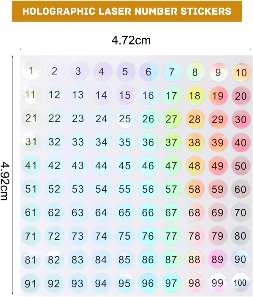 Number Stickers 1-100 Small Round Numbers For Office Home Kitchen Classroom New Number Stickers 1-100 Small Round Numbers Stickers 5 Sheets Self Adhesive Number Labels Consecutive Number Stickers for Office Home Kitchen Classroom etc Product Description: These Number Stickers 1-100 come in a convenient pack of five sheets, offering a range of small, round adhesive numbers for various applications. Perfect for labeling items in offices, homes, kitchens, classrooms, or organizing personal belongings, these consecutive number labels are easy to peel and apply to any clean surface. Whether you’re organizing, teaching, or crafting, these self-adhesive stickers offer a practical solution for your labeling needs. Features: Consecutive Numbering: Includes 1-100 numbers, ideal for sequential labeling in any project. Small and Round Design: Compact, easy-to-read numbers in a round format, fitting neatly on a variety of surfaces. Self-Adhesive: Simple to peel and stick, these labels adhere securely without leaving residue behind. Multiple Uses: Perfect for organizing files, folders, storage bins, classroom activities, and more. Durable and Reliable: Made with high-quality materials to ensure the numbers stay intact through everyday handling. Pack of Five Sheets: Each pack contains five sheets of stickers, offering plenty of labels for large projects. Versatile Application: Suitable for home, office, classroom, kitchen, or any place where organization is needed. Easy to Apply: The adhesive backing makes it simple to apply and reposition the labels as needed. Item dimensions L x W x H 4.92 x 4.72 x 0.01 inches Item Form Sheet Number of Pieces 500 Indoor/Outdoor Usage Outdoor Surface Recommendation Wood, Glass, Plastic, Metal Material Vinyl Color Multicolor Pattern Number Recommended Uses For Product Scrapbook Material Type Vinyl Item Weight 0.423 ounces Theme Number Number of Items 500 Shape Round Unit Count 1.0 Count Finish Type smooth Product Dimensions 4.92 x 4.72 x 0.01 inches Size 0.4'' Shipping Fast shipping is very important for us. Our standard USA shipping service is FREE. Your order will be shipped within 1-2 business days upon full payment received. Your order will be delivered within 1-3 business days after the handling time. We only ship to the confirmed address. We reserve the right to cancel any order for any reason at any time. We are not responsible for undeliverable addresses. Returns and payment We offer a 30 days return policy from checkout winning date. FeedBack Your feedback very important to us, after you get your package and you are satisfied with our service please leave us positive feedback If you have any problem with your order / any questions please before leave any type of feedback For any questions, using eBay contact system Please visit our eBay store to check out other items for sale! Thank you for shopping at our store.
