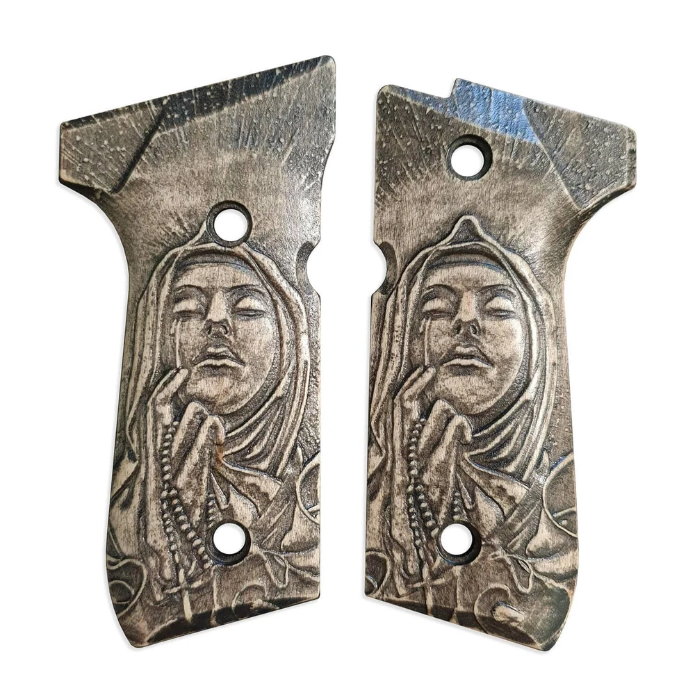 New Beretta 92, 92A1, 92G, 92FS, 96, 96A1, 98FS, 98A1, M9, M9A1 grips with "Nun" design. Carved from solid natural wood - Cut by CNC. Grinded, painted and oiled by hand