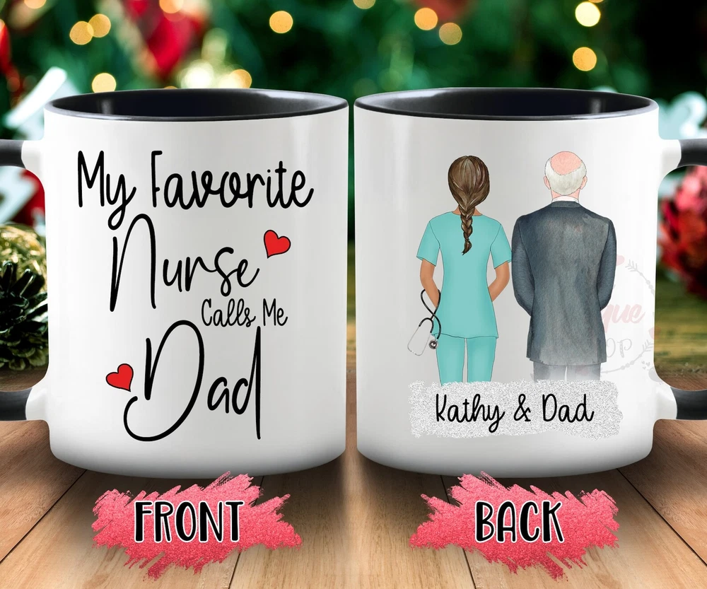 Nurse Dad Gift Father Of Nurse Fathers Day Gift From Daughter My Favorite Nurse Calls Me Dad Coffee Mugs Proud Dad Of A Nurse Rn Dad Product Details.. This high quality 11oz. ceramic white mug has a premium hard coat that provides crisp and vibrant color reproduction sure to last for years. Perfect for all hot & cold beverages. The highest quality printing possible is used. It will never fade no matter how many times you wash it. Material: 100% Ceramic. Print both sides. Dishwasher and Microwave Safe. High Gloss + Premium White Finish. Printed in the U.S.A. Personalized & Custom. We support personalized and custom mug to add custom, when placing an order, you can add notes to the "order note" in shipping address section. Also you can contact us directly via message. Shipping Info. Ready to ship in 1 to 2 business days, All products are made-to-order and proudly printed in the United States. Shipped by USPS and DHL, You will receive your order in 5-7 days. Replace & Refund. All products are defective during shipping broken, chipped will be replaced free of charge. You are not satisfied with the product, we will refund 100% money to you. If any other issues arise, please do not hesitate to message, we would be more than happy to assist you.