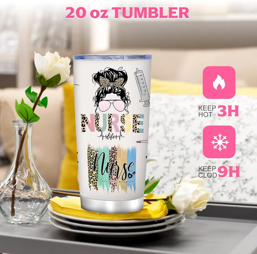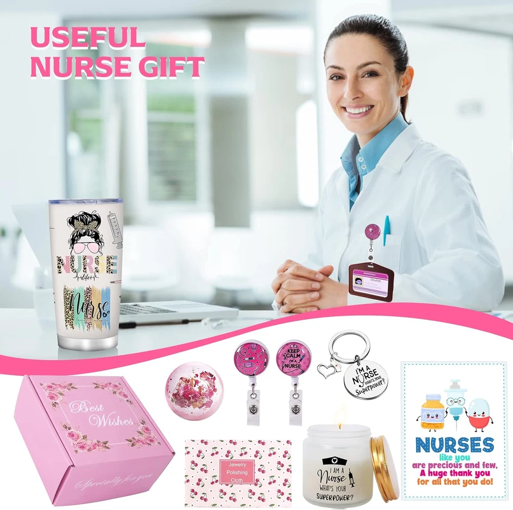 Perfect nurse appreciation gift: Our nurse gift box is the perfect way to show your appreciation for the hard work and dedication of the nurses in your life. Each item in the box is carefully chosen with nurses in mind, making it a thoughtful and practical gift. The 20 oz original design stainless steel tumbler is a high-quality, double-walled vacuum insulated mug that keeps drinks at the perfect temperature for hours. The tumbler is made from premium stainless steel, which is durable, rust-resistant, and easy to clean. Its original design features a sleek and stylish appearance that any nurse will love. With a large capacity, this tumbler is perfect for long shifts, outdoor adventures, or just relaxing at home. The scented candle and bath bomb in our nurse gift box offer a luxurious way to unwind after a long day on the job. The scented candle fills the room with a warm, inviting aroma, while the bath bomb releases soothing essential oils and minerals that nourish the skin and promote relaxation. These two items work together to create a spa-like atmosphere in the comfort of your own home, making them the perfect addition to any nurse's self-care routine. The two nurse badge scroll holders are essential for displaying identification badges or work cards, and the keyring adds a touch of personality to any set of keys., while the jewelry polishing cloth helps keep any cherished pieces of jewelry looking their best. The greeting card is the perfect finishing touch to show your heartfelt gratitude. This nurse appreciation gift box is perfect for National Nurses Week, as a thank you for your nursing staff, or for any nurse in your life who deserves to be recognized and celebrated. Product Description