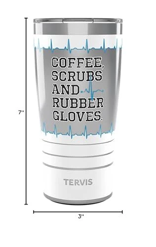 insulated drinkware delivers the ultimate combination of personality and performance for pure drinking enjoyment. Features: Stainless steel insulated tumbler with professional design On cup: Coffee, scrubs and rubber gloves Sweat-proof, double-wall, vacuum-insulated construction Keeps drinks hot for 8 hours and ice cold for 24 hours Includes splash-proof, shatter-proof, easy-close lid BPA-free polymer lid material Hand wash with soap and water. Use scratch-free sponge Limited Copper-lined 18/8 stainless steel material Holds 20 oz. of your favorite beverage