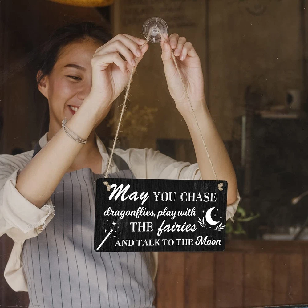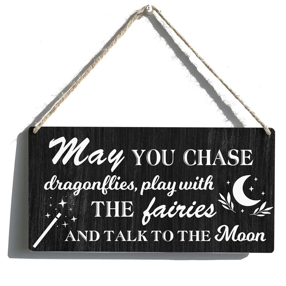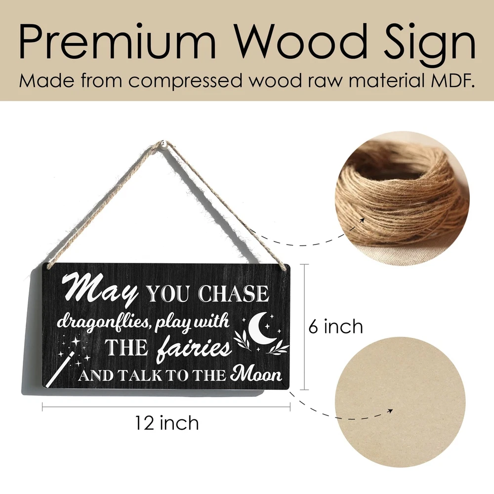 Nursery Sign Gift Farmhouse May You Chase Dragonflies Play with the Fairies Wooden Hanging Sign Plaque Rustic Wall Art Decor for Home Decoration 12 x 6 Inches Product Details Color: may Brand: Qious MPN: decorative plaque UPC: Does not apply EAN: Does not apply Color: may Brand: Qious Material: Engineered Wood, Wood, Ceramic Theme: Funny Recommended Uses For Product: Office Mounting Type: Wall Mount Product Dimensions: 12"L x 6"W Shape: Square Item Weight: 200 Grams Style: Versatile Pre-printed: May you chase dragons, play with the fairies and talk to the moon. Included Components: Pre-cut hanging holes, Twine Item Weight: 7.1 ounces Manufacturer: Qious Country of Origin: China Item model number: decorative plaque Sign Size:Measures approximately 6"x12". Premium Wood Sign: Made from compressed wood raw material MDF. Each sign has 2 pre-cut hanging holes and a length of twine. It is an attractive and versatile country style. Easy Hanging: Installation is extremely easy. Comes with hanging holes and twine so it's ready to hang. Attractive Appearance: This meaningful decoration is suitable for someone who means something to you. Funny signs will make the recipient smile. Natural wood rustic sign, with excellent texture, can hang beautifully. For Gift Giving:Our wooden signs are the perfect gift for loved ones or as a special treat for yourself. It works great, looks great and adds fun to any space in the home, office, classroom, kitchen, bathroom, study, and more. For Gift Giving:Our wooden signs are the perfect gift for loved ones or as a special treat for yourself. It works great, looks great and adds fun to any space in the home, office, classroom, kitchen, bathroom, study, and more.