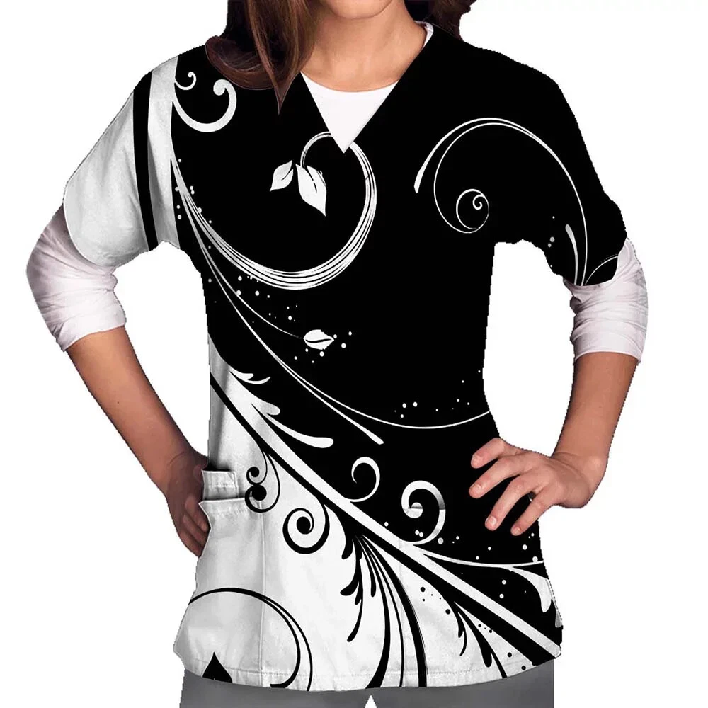 Nursing Uniform Woman Clothes Scrub Top with Pocket Floral Printed V-Neck Blouse