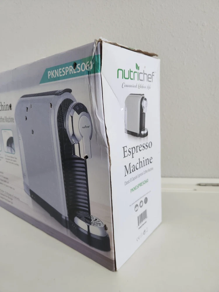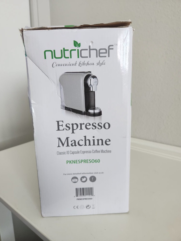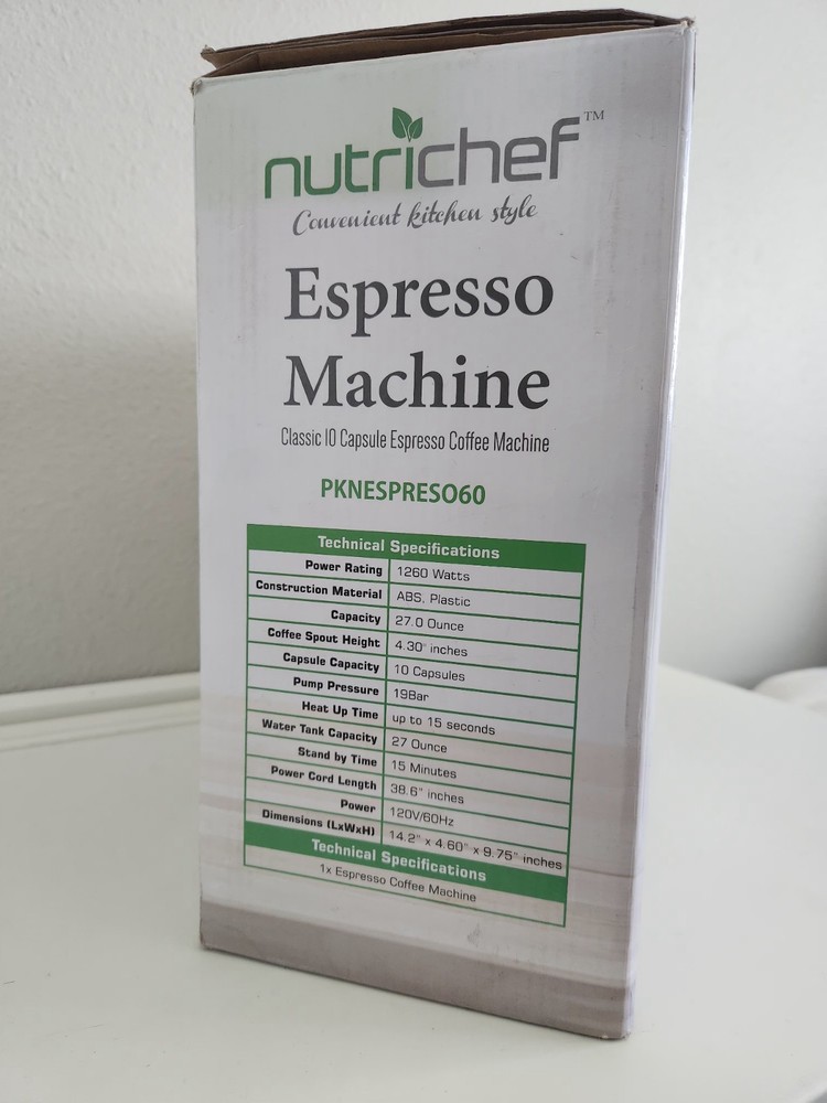 Nutrichef PKNESPRESO60 Espresso Machine. Brand new, open box. Technical Specifications Power Rating-1260 Watts Construction Material-ABS, Plastic Capacity-27.0 Ounce Coffee Spout Height-4.30' inches Capsule Capacity-10 Capsules. Pump Pressure-19Bar Heat Up Time-up to 15 seconds Water Tank Capacity-27 Ounce Stand by Time-15 Minutes Power Cord Length-38.6" inches Power-120V/60H2 Dimensions (LxWxHI 14.2" x 4.60" x 9.75" inches